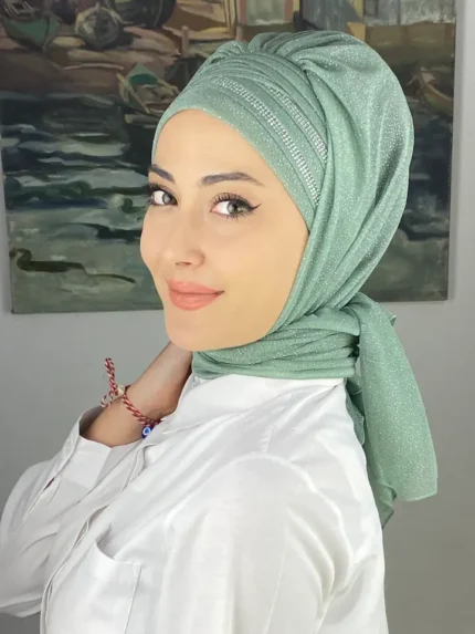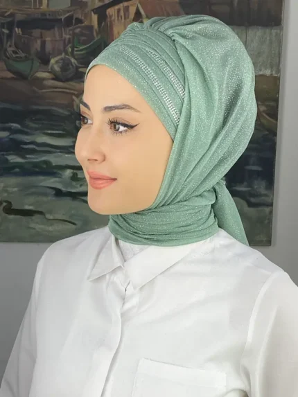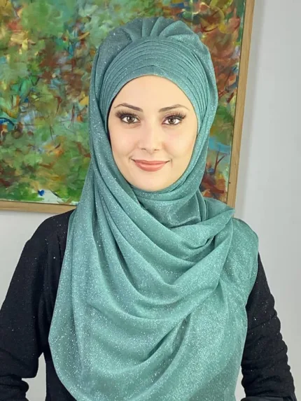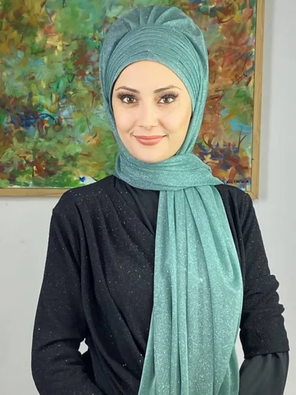 Sultan Model Simli Şifon Büzgülü Şal – Su Yeşili