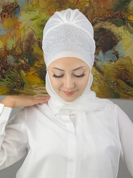Vintage Model Taşlı Abiye Atkılı Bone Şal – Beyaz