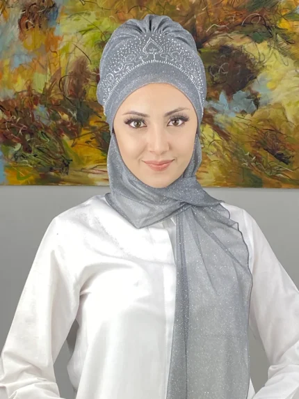 Vintage Model Taşlı Abiye Atkılı Bone Şal – Gri
