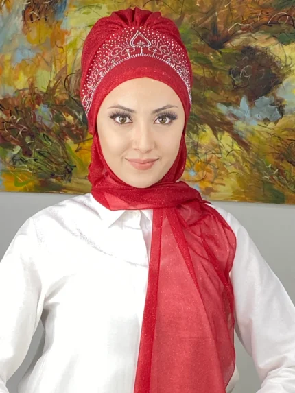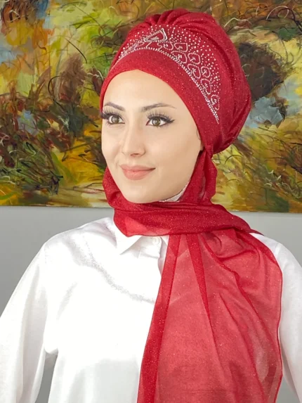 Vintage Model Taşlı Abiye Atkılı Bone Şal – Kırmızı