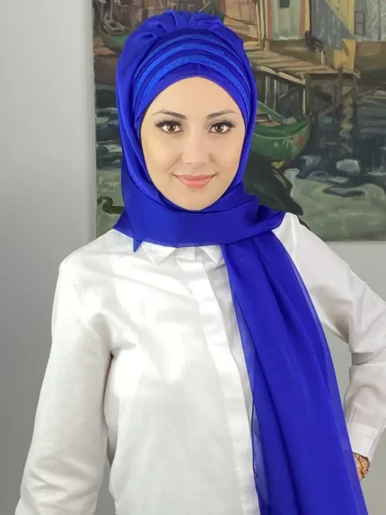 Topkapı Çapraz Drapeli Biritleri Simli Fransız Şifon Hazır Şal – Saks Mavisi