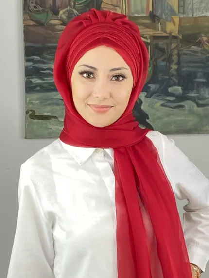 Topkapı Çapraz Drapeli Biritleri Simli Fransız Şifon Hazır Şal – Kırmızı