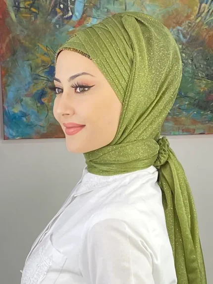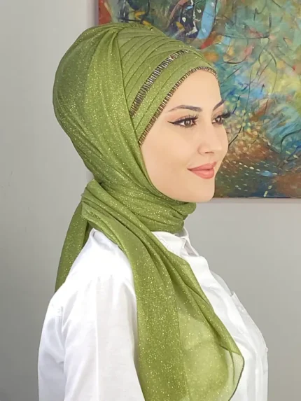 Dilber Model Çok Drapeli Sim Detaylı Şal – Yağ Yeşili