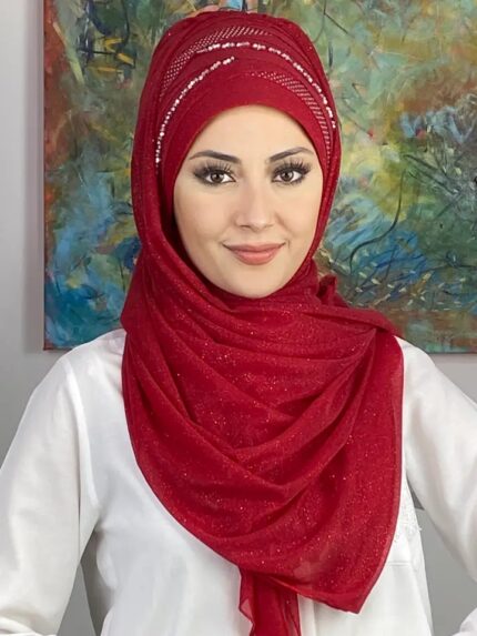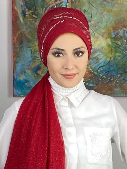 Boncuk Detaylı Drapeli Bone Şal – Kırmızı