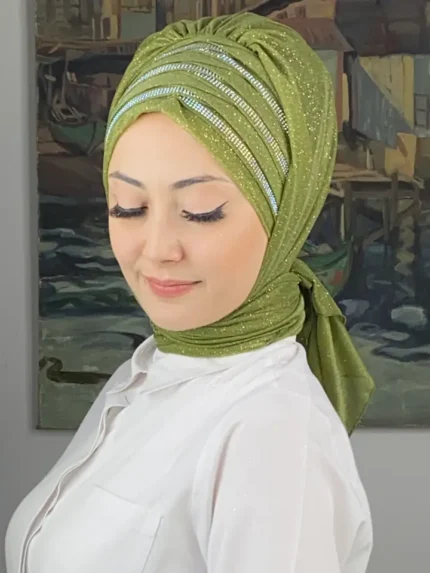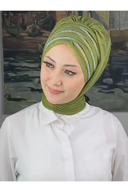 Lüks Topkapı Model Taşlı Simli Kısa Abiye Hazır Şal – Açık Yağ Yeşili
