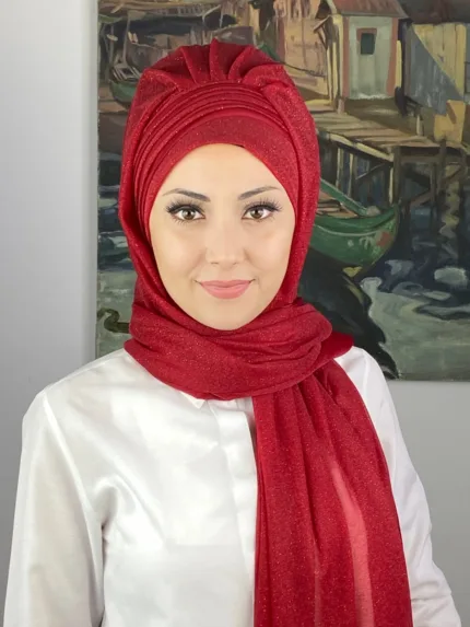 Saray Model Fransız Şifon Drapeli Simli Hazır Şal – Kırmızı