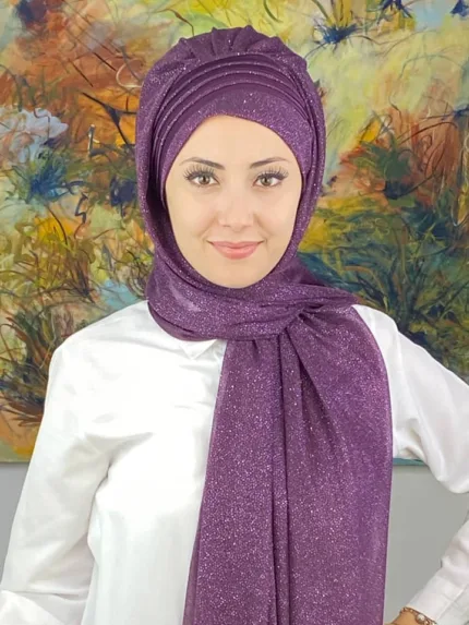 Saray Model Fransız Şifon Drapeli Simli Hazır Şal – Koyu Mor