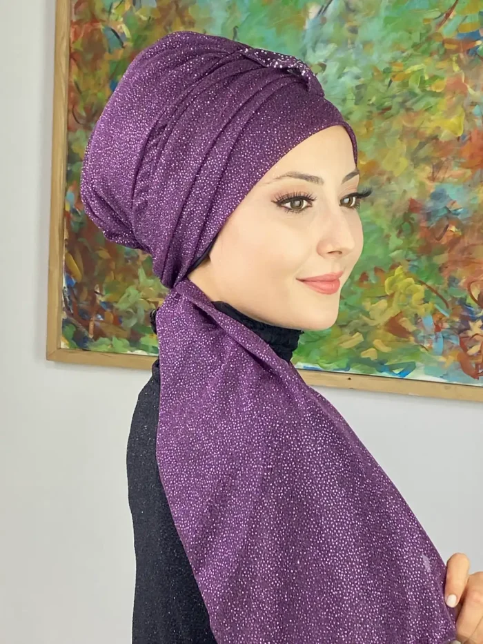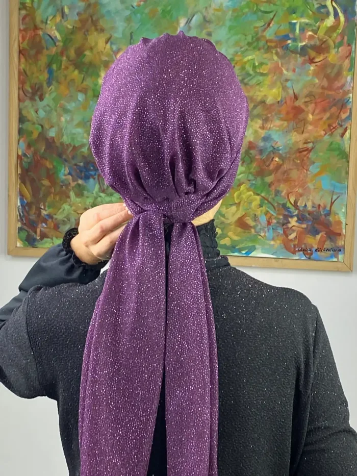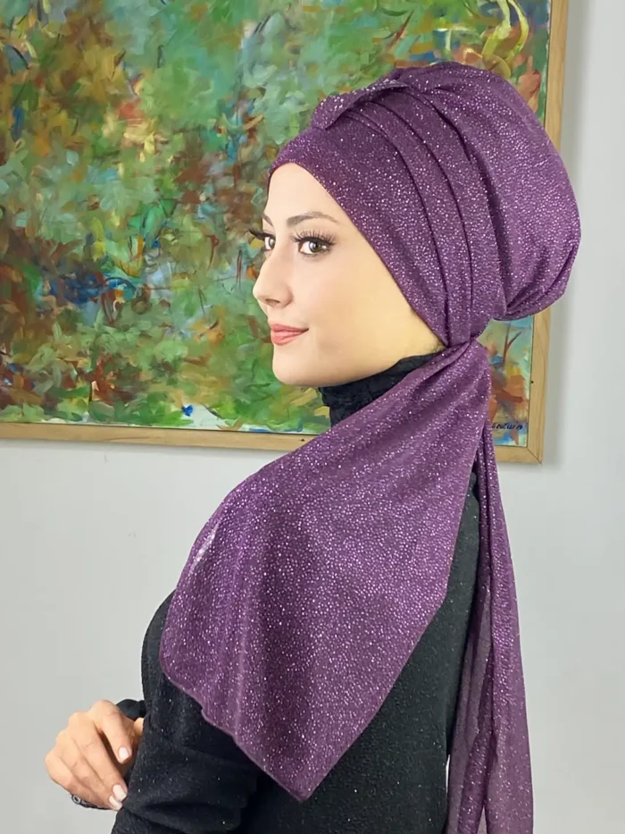Simli detaylar, mor rengin zengin tonuyla birleşerek modern bir ışıltı oluşturur.