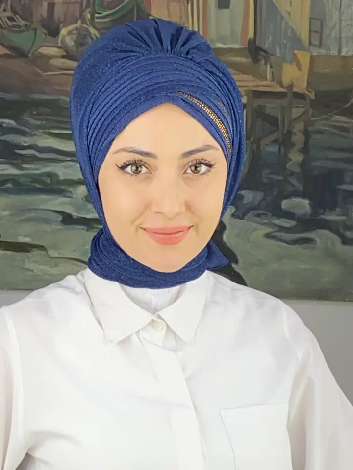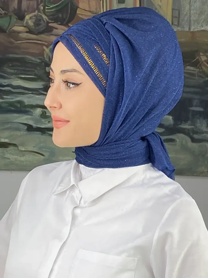 Lacivert, zarif bir renk olup, her kıyafetle mükemmel uyum sağlar. Altın taşlar, şalın her adımda parlamasını sağlar ve şıklığınızı tamamlar. Drapeli yapısı ise şalın doğal bir şekilde düşmesini sağlar.