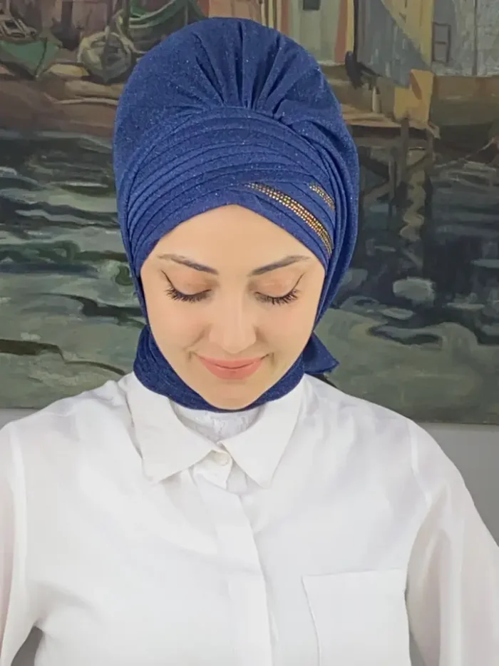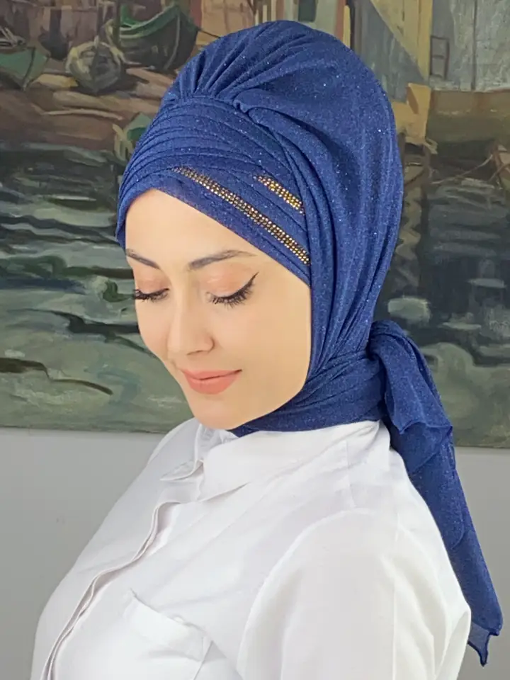 Lacivert rengi ve altın taş detaylarıyla şıklığınızı tamamlamak için hemen Altın Taşlı Çok Drapeli Simli Şal – Lacivert’i sipariş verin!