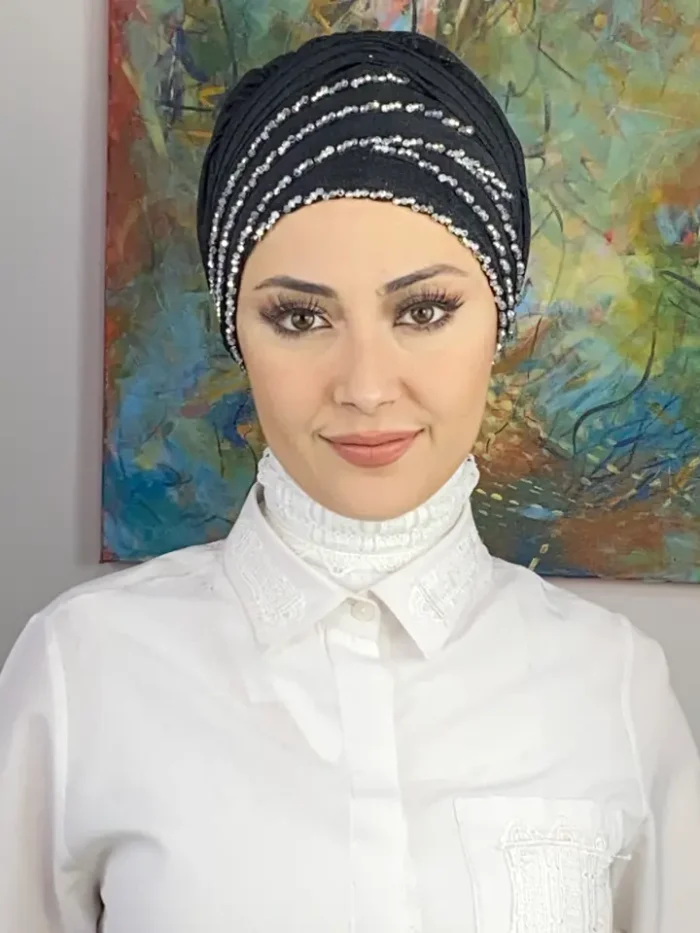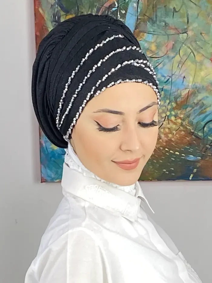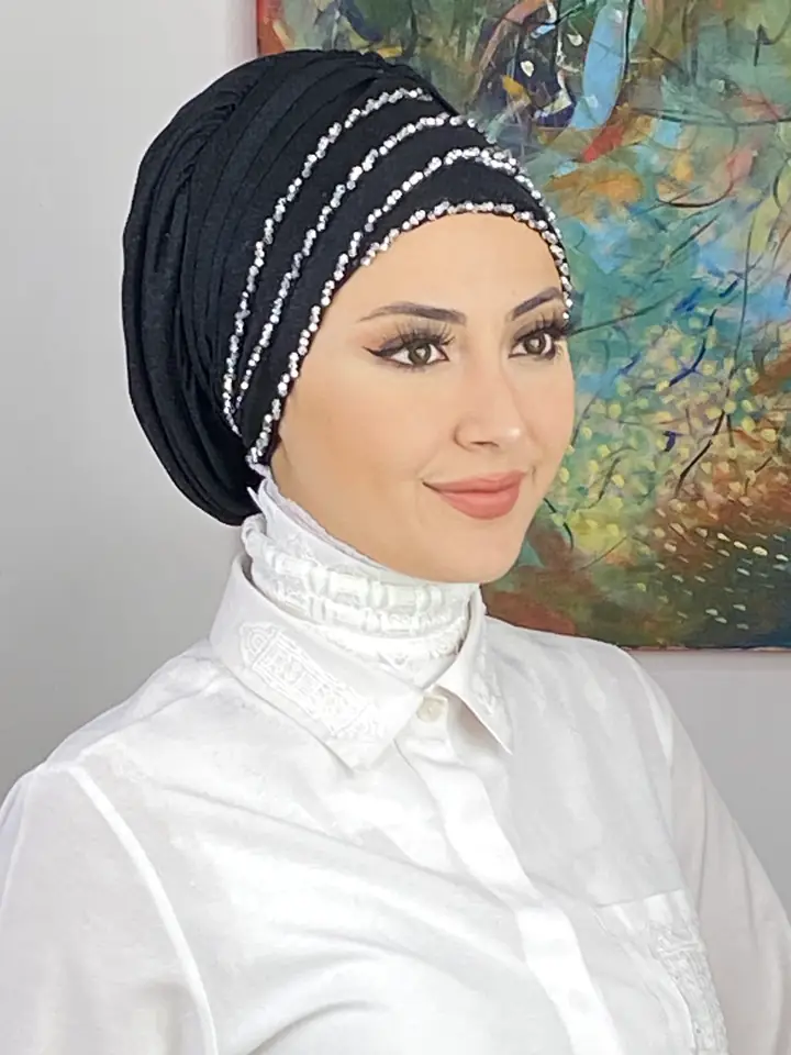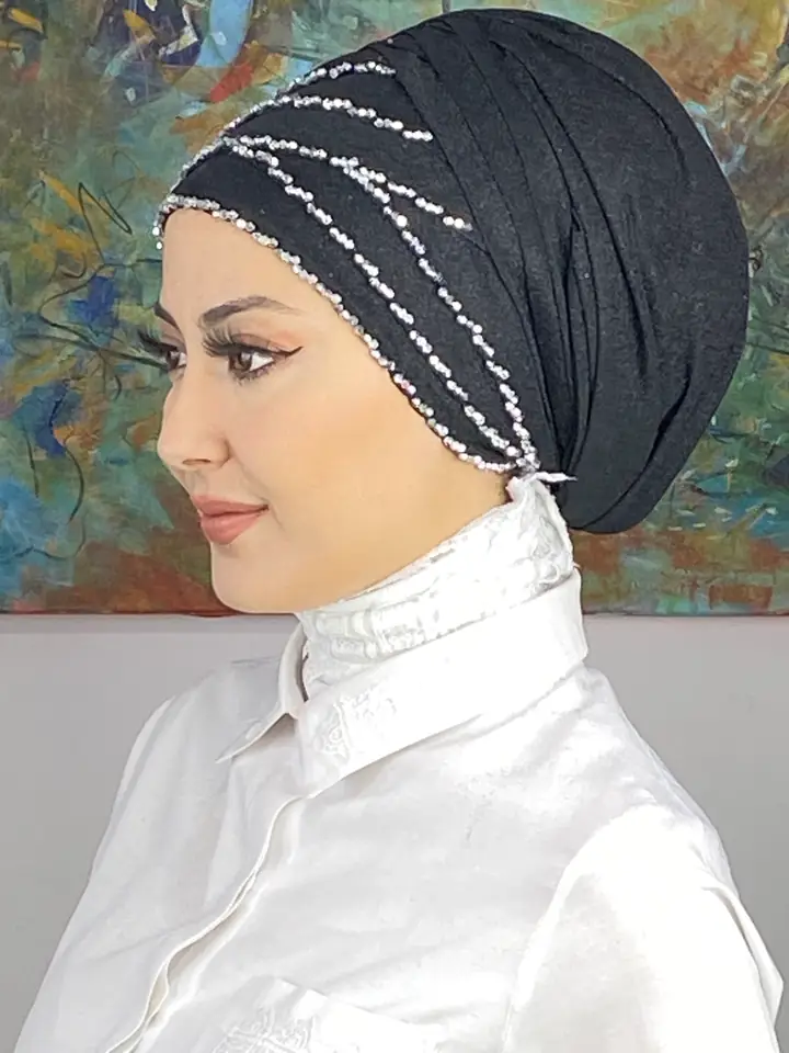 Boncuk Detaylı Drapeli Bone Şal – Siyah – Simli