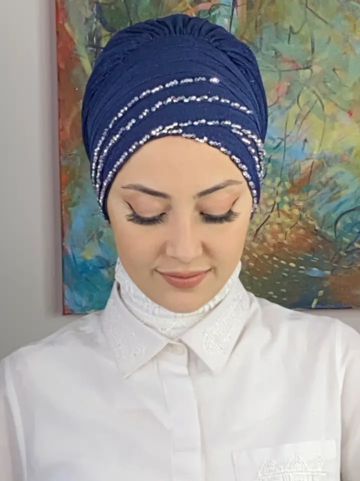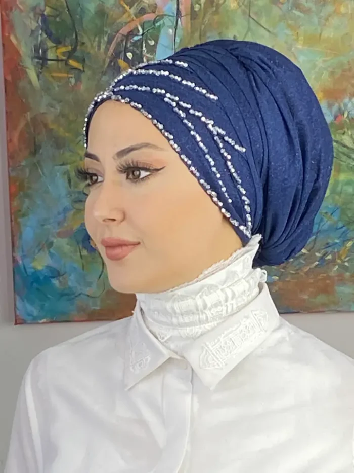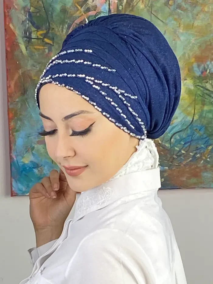 Boncuk Detaylı Drapeli Bone Şal – Koyu Lacivert: Şıklığın ve Zarafetin Buluştuğu Parça