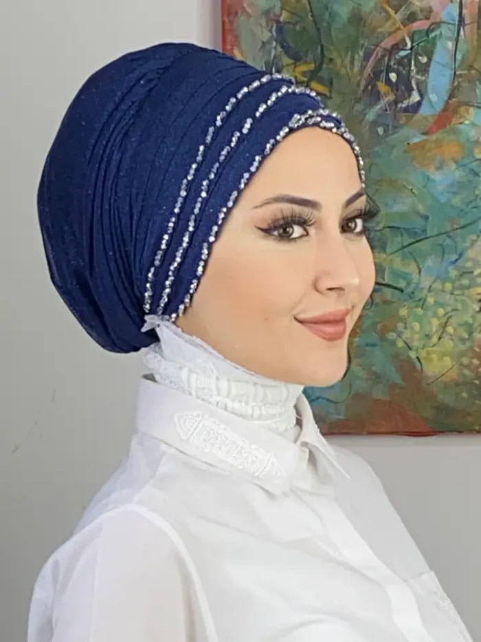 Sadece estetik açıdan değil, kullanım kolaylığı ve konforu da göz önünde bulundurularak tasarlanmış olan Boncuk Detaylı Drapeli Bone Şal – Koyu Lacivert, baş örtüsü takmanın pratikliğini artırmaktadır. Başınıza kolayca yerleşen ve gün boyu rahatça sabit kalan bu tasarım, her açıdan sizi memnun edecektir.