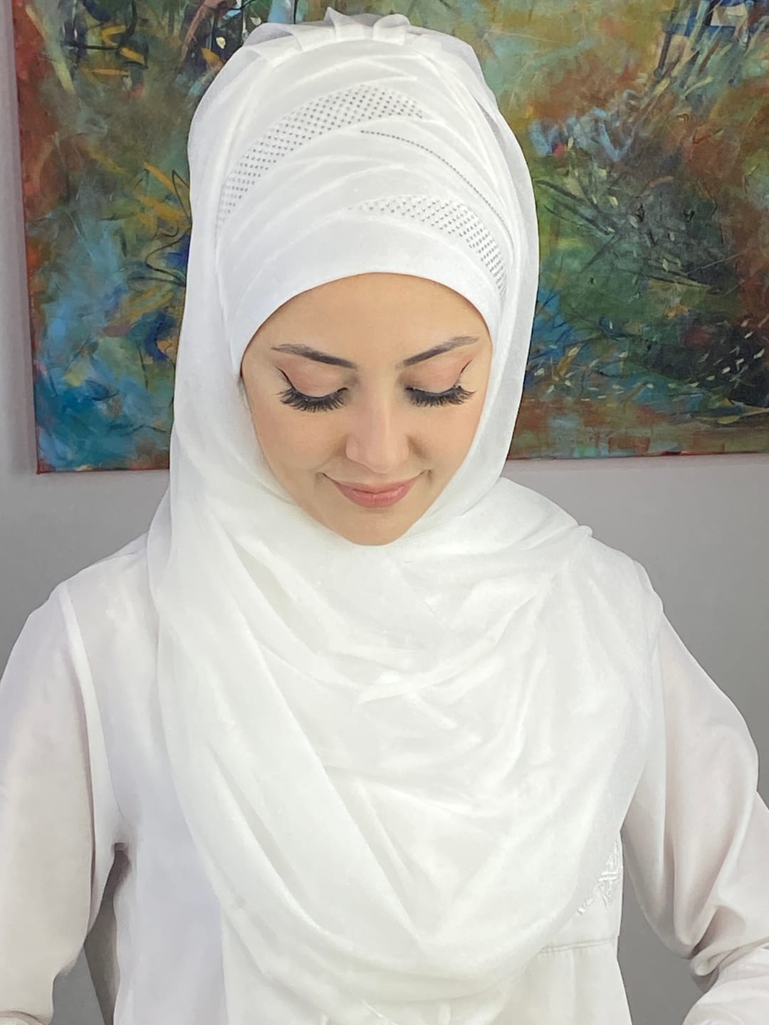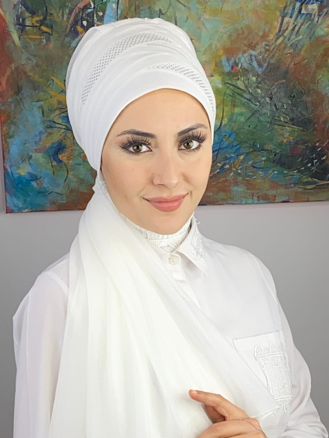 Bu şal, hafif ve nefes alan kumaş yapısı sayesinde uzun süreli kullanımlarda bile rahatsızlık vermez. Bağlama derdi olmadan tak-çıkar pratikliği sunar. Şalın özel dikimi kaymaları engeller, kusursuz formu bozulmadan durur.