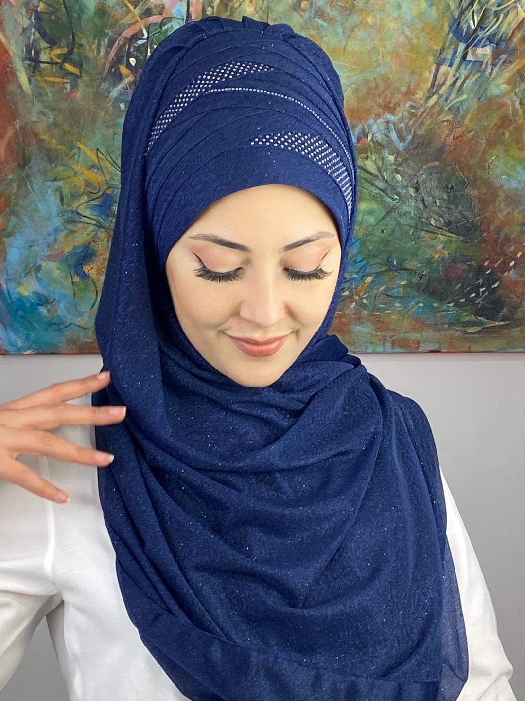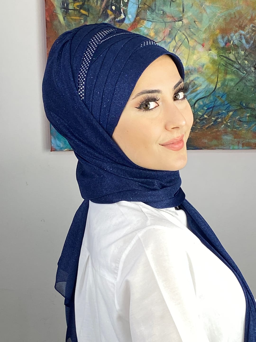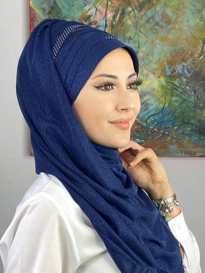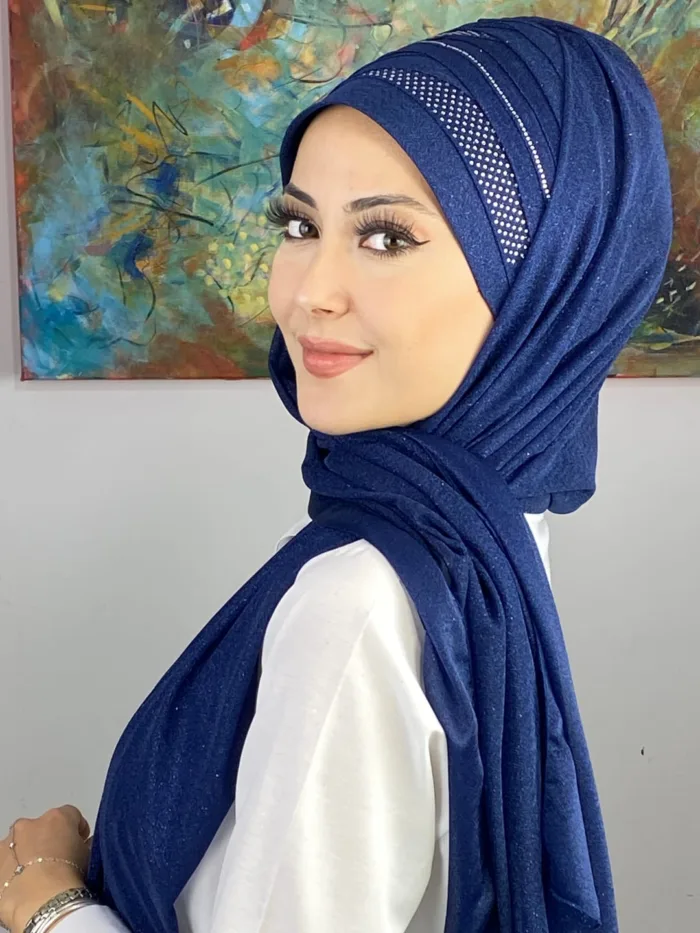 Tesettür abiye modasında en çok tercih edilen tonlardan biri olan koyu lacivert, her stile uyum sağlar. Şalın her detayı özenle işlenmiş olup kaliteyi ilk bakışta hissettirir.