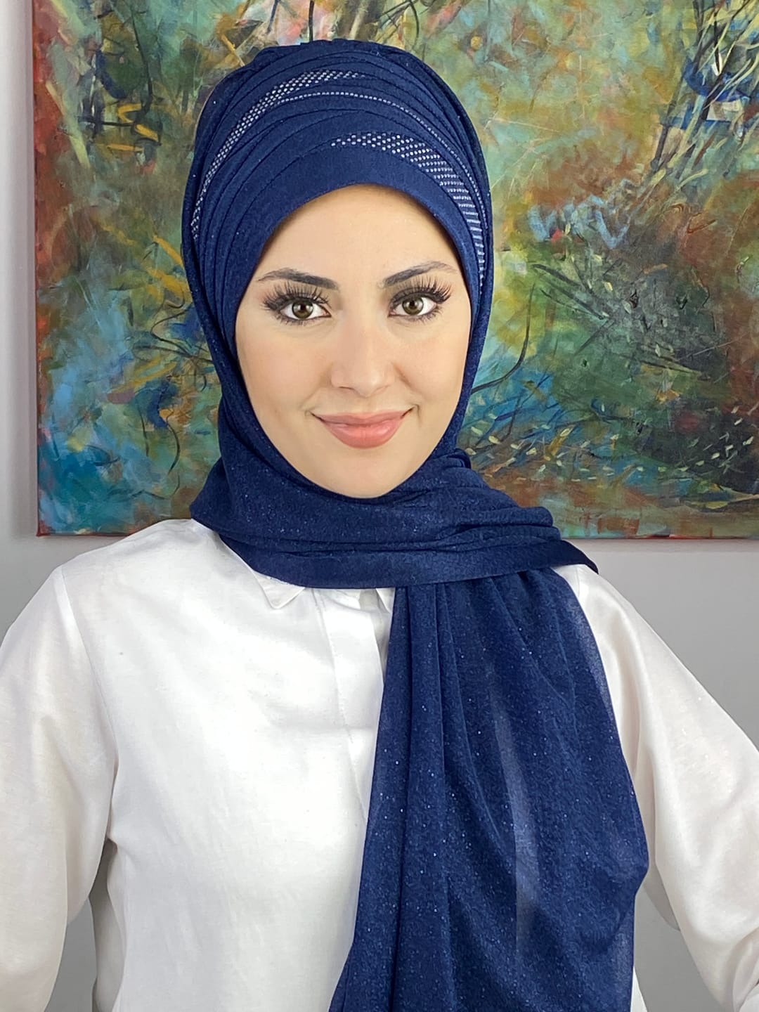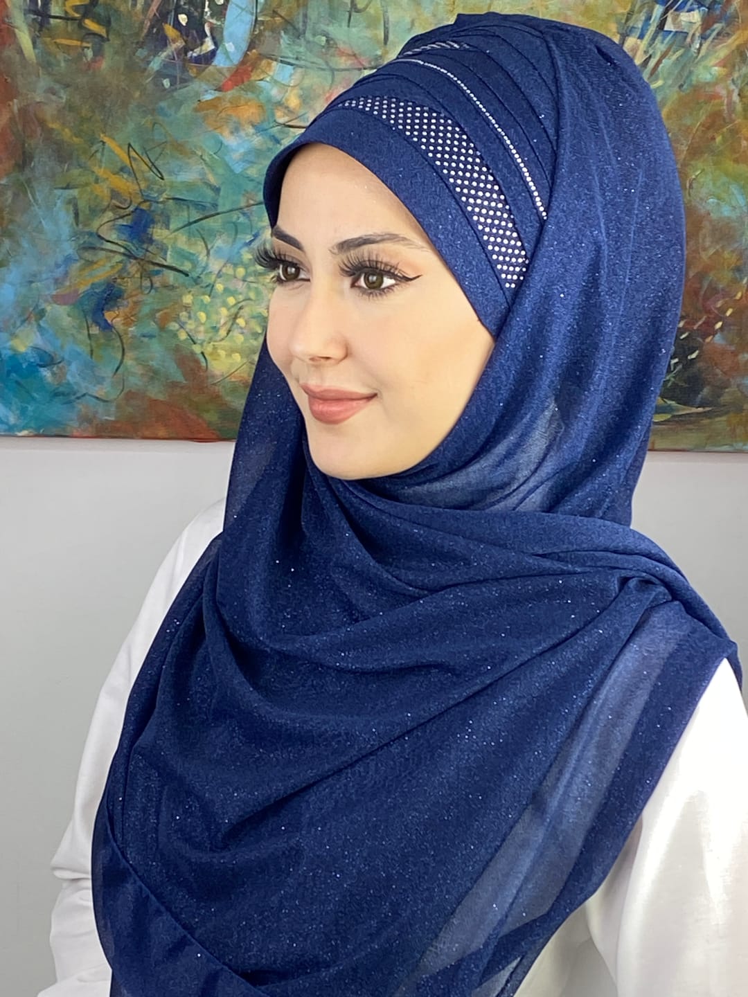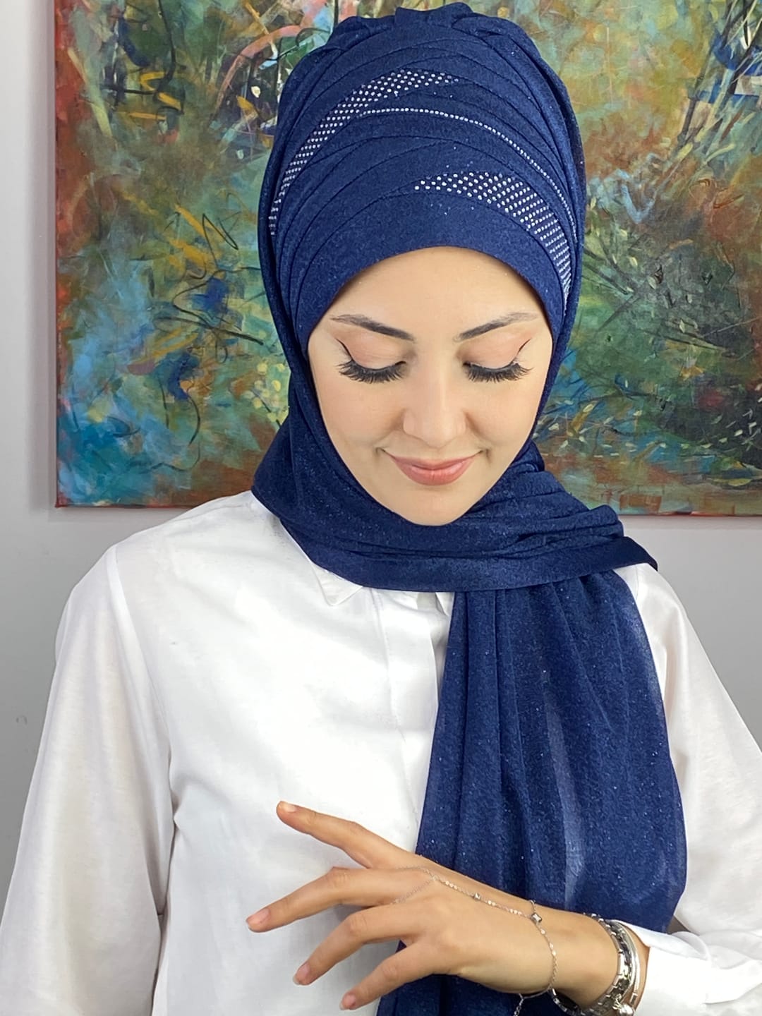 Tesettür abiye modasında en çok tercih edilen tonlardan biri olan koyu lacivert, her stile uyum sağlar. Şalın her detayı özenle işlenmiş olup kaliteyi ilk bakışta hissettirir.