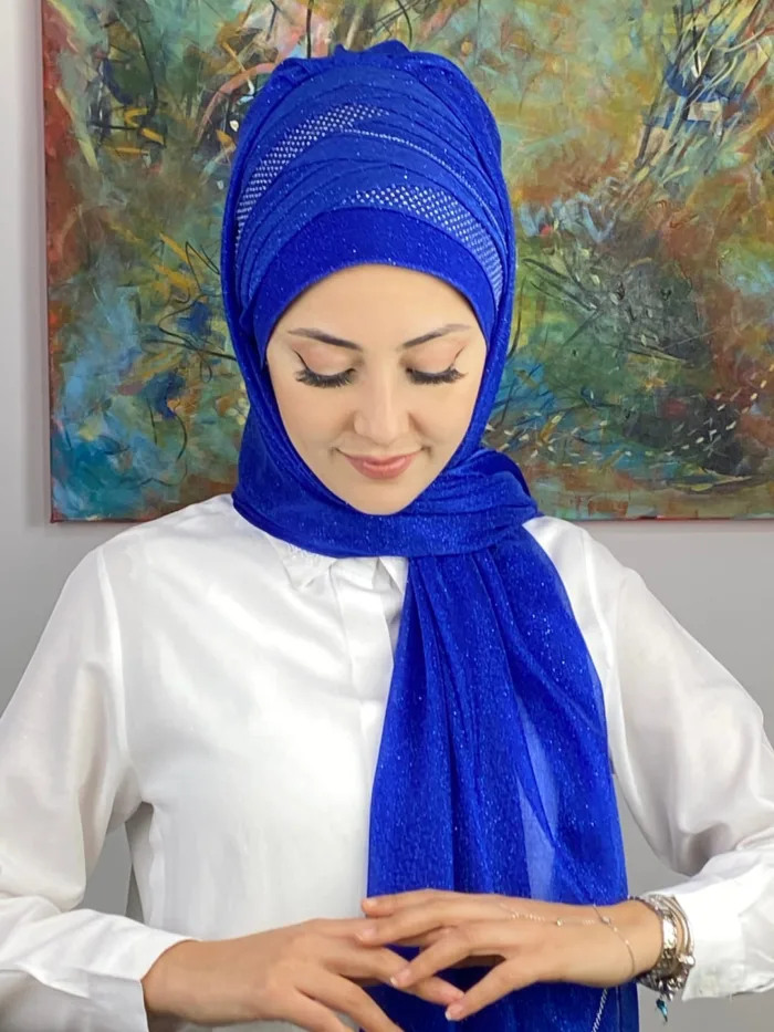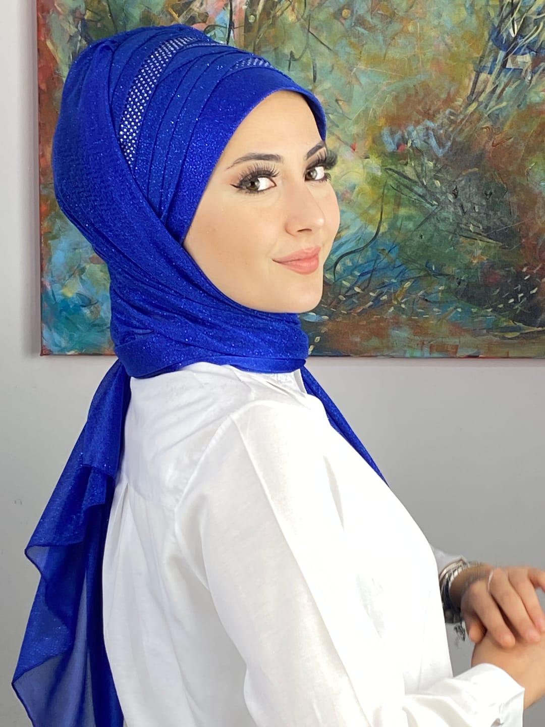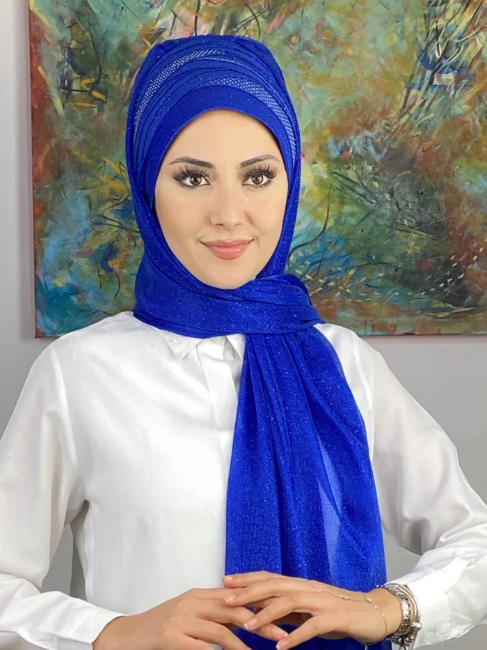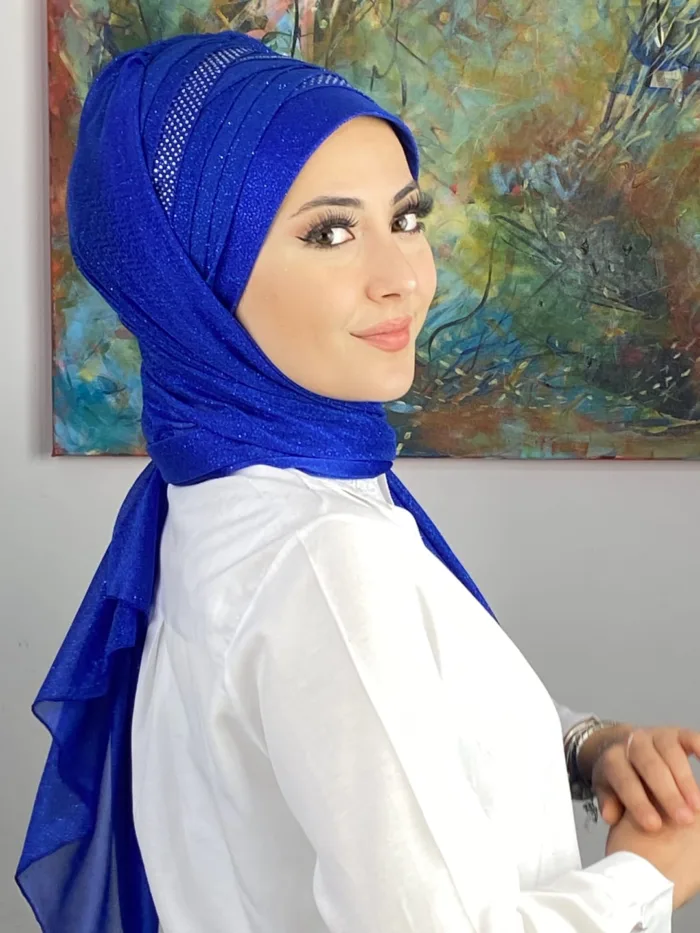 Model üzerinde kullanılan boncuk işlemeleri, saçtan kaymayı önlerken şala modern bir duruş kazandırır. Simli şifon kumaş ise ışıltıyı en zarif şekilde yansıtarak gece davetlerinden düğün ve nişanlara kadar her kombini üst seviyeye taşır. Saks mavisinin prestijli duruşu, ten tonunu canlı gösterir ve tüm abiyelerin en göz alıcı eşlikçisi olur.