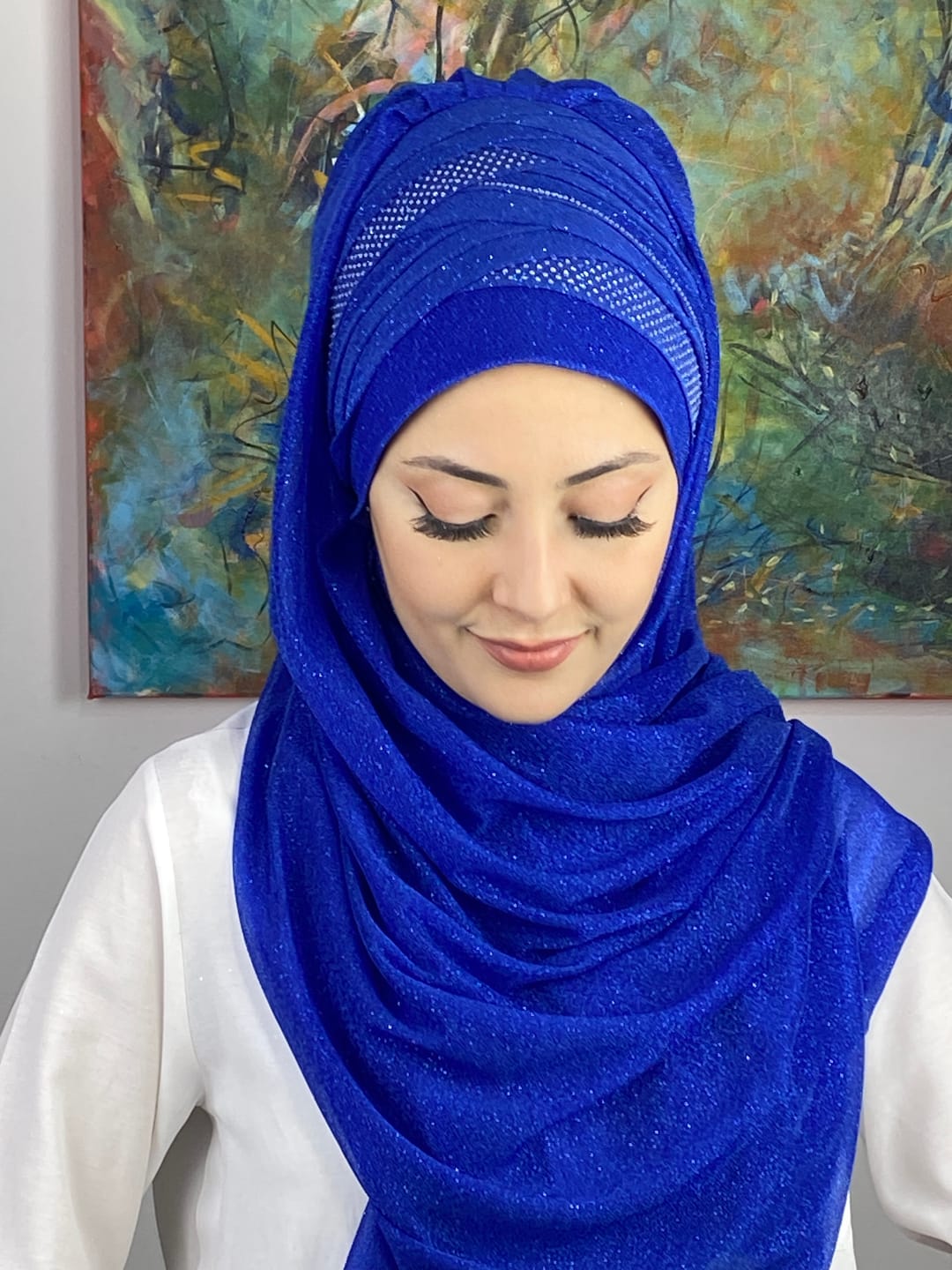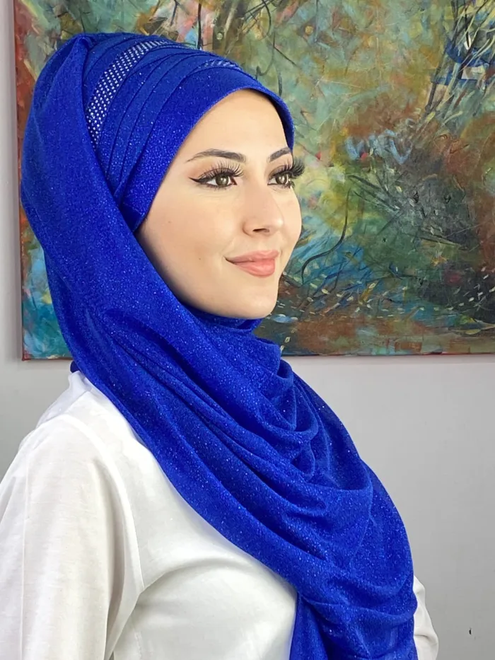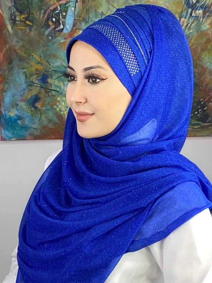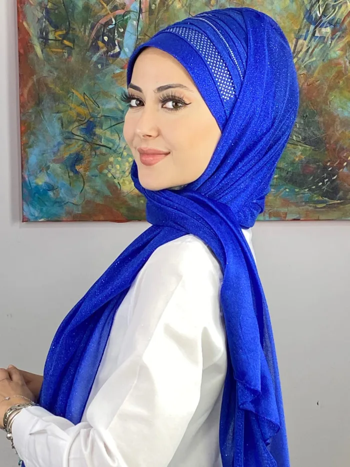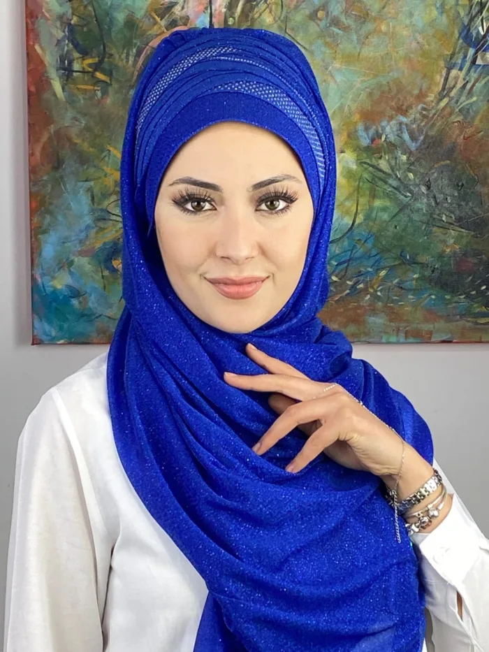 Model üzerinde kullanılan boncuk işlemeleri, saçtan kaymayı önlerken şala modern bir duruş kazandırır. Simli şifon kumaş ise ışıltıyı en zarif şekilde yansıtarak gece davetlerinden düğün ve nişanlara kadar her kombini üst seviyeye taşır. Saks mavisinin prestijli duruşu, ten tonunu canlı gösterir ve tüm abiyelerin en göz alıcı eşlikçisi olur.