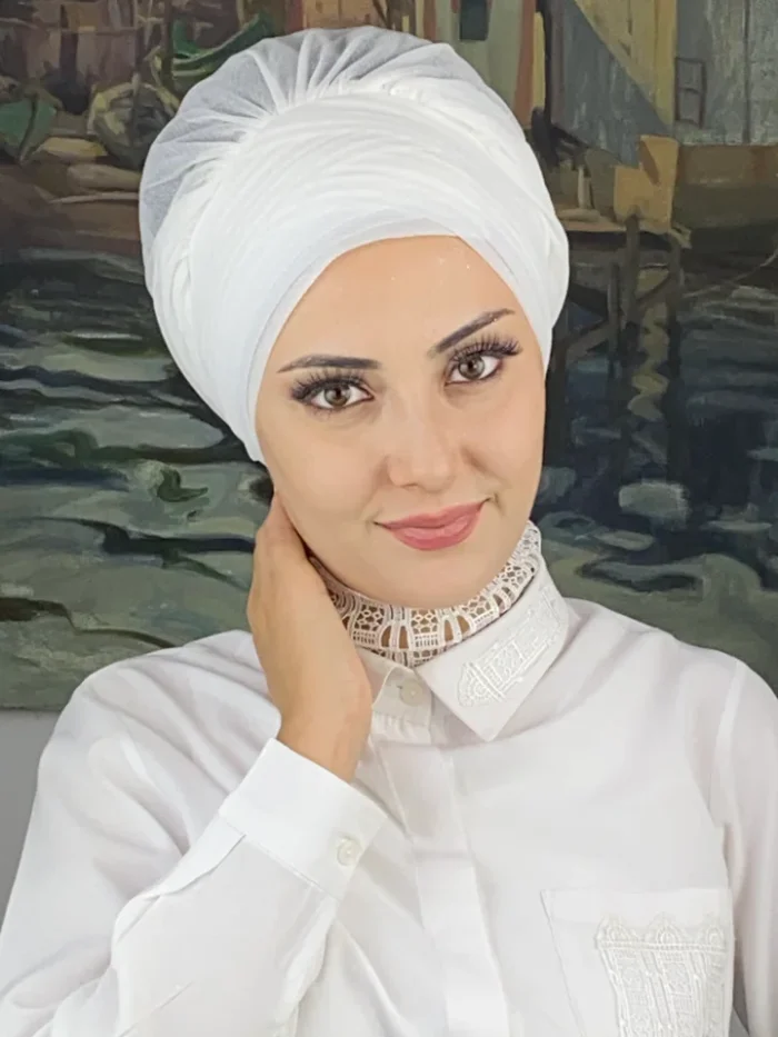 Çapraz Çok Drapeli Taşsız Abiye Bone Şal – Beyaz