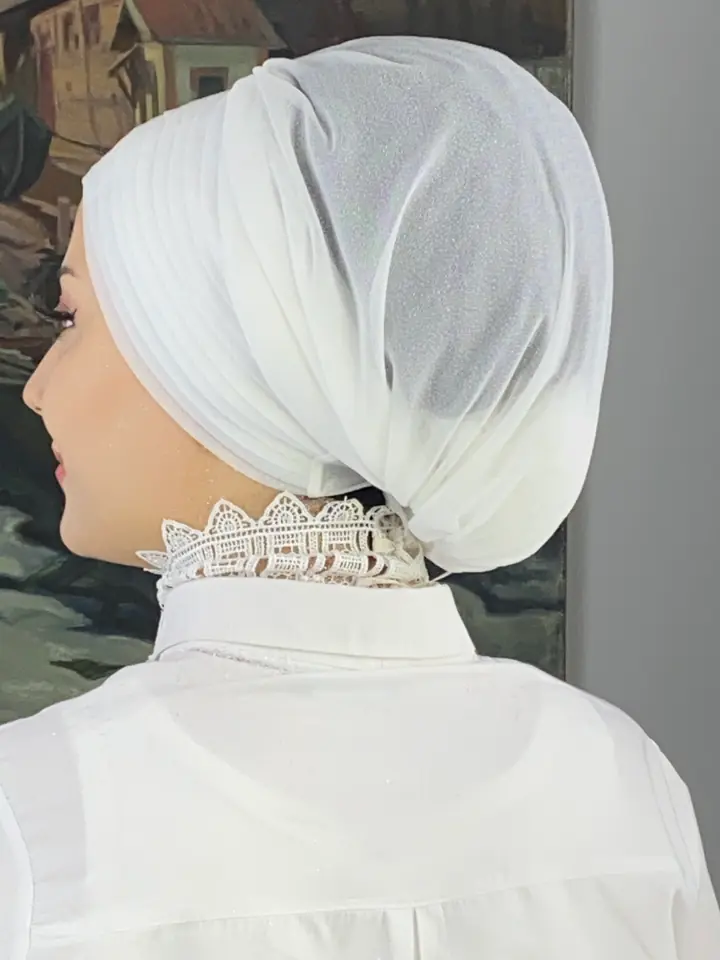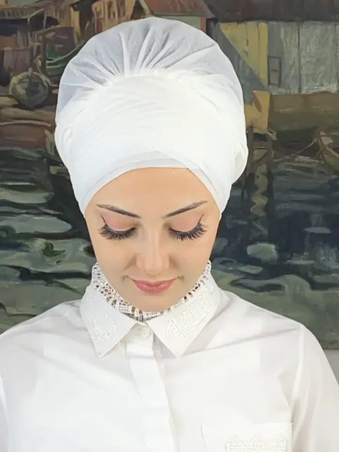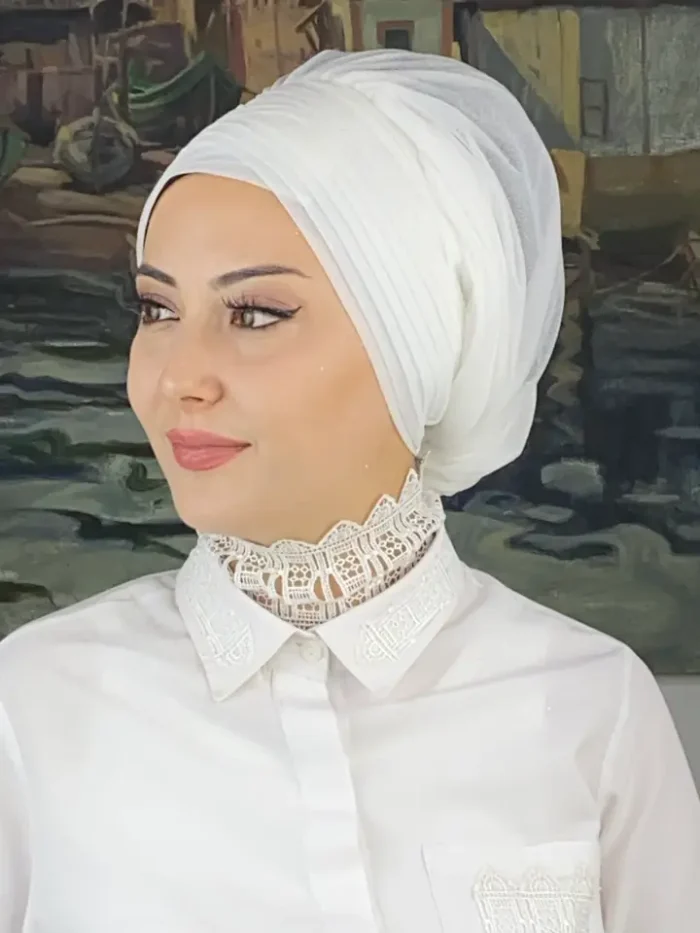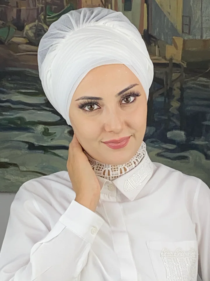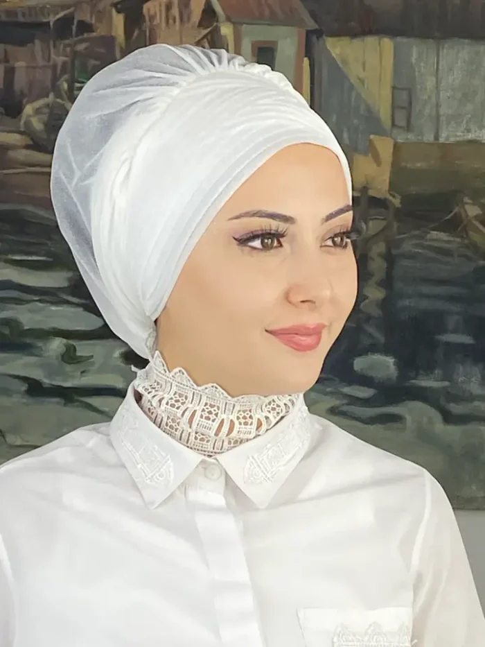Çapraz Çok Drapeli Taşsız Abiye Bone Şal – Beyaz 🤍