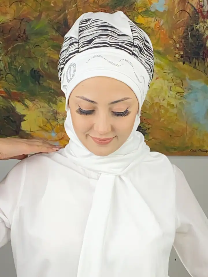 Tesettür aksesuarlarında konfor, uzun süreli kullanım açısından oldukça önemlidir. Çarkıfelek Model Çizgili Kemer Desenli Taşlı Atkılı Bere – Beyaz, esnek ve başı sıkmayan kalıbı sayesinde gün boyu rahat bir kullanım sunar. Yumuşak dokusu ciltle uyum sağlar ve rahatsızlık hissi oluşturmaz.