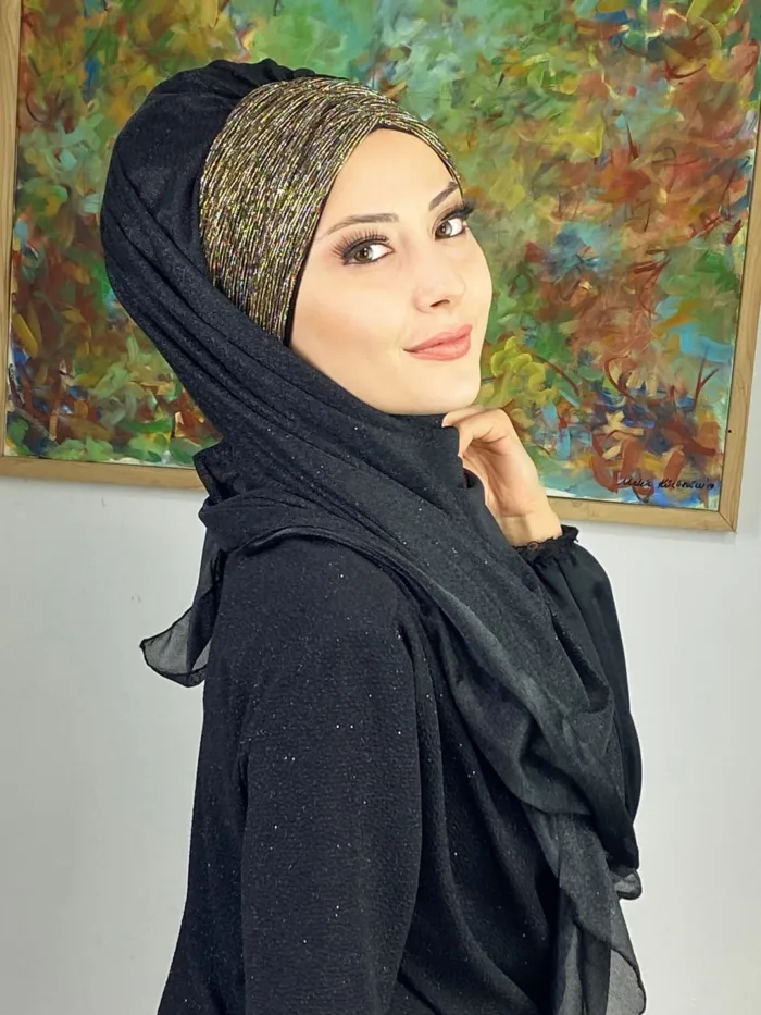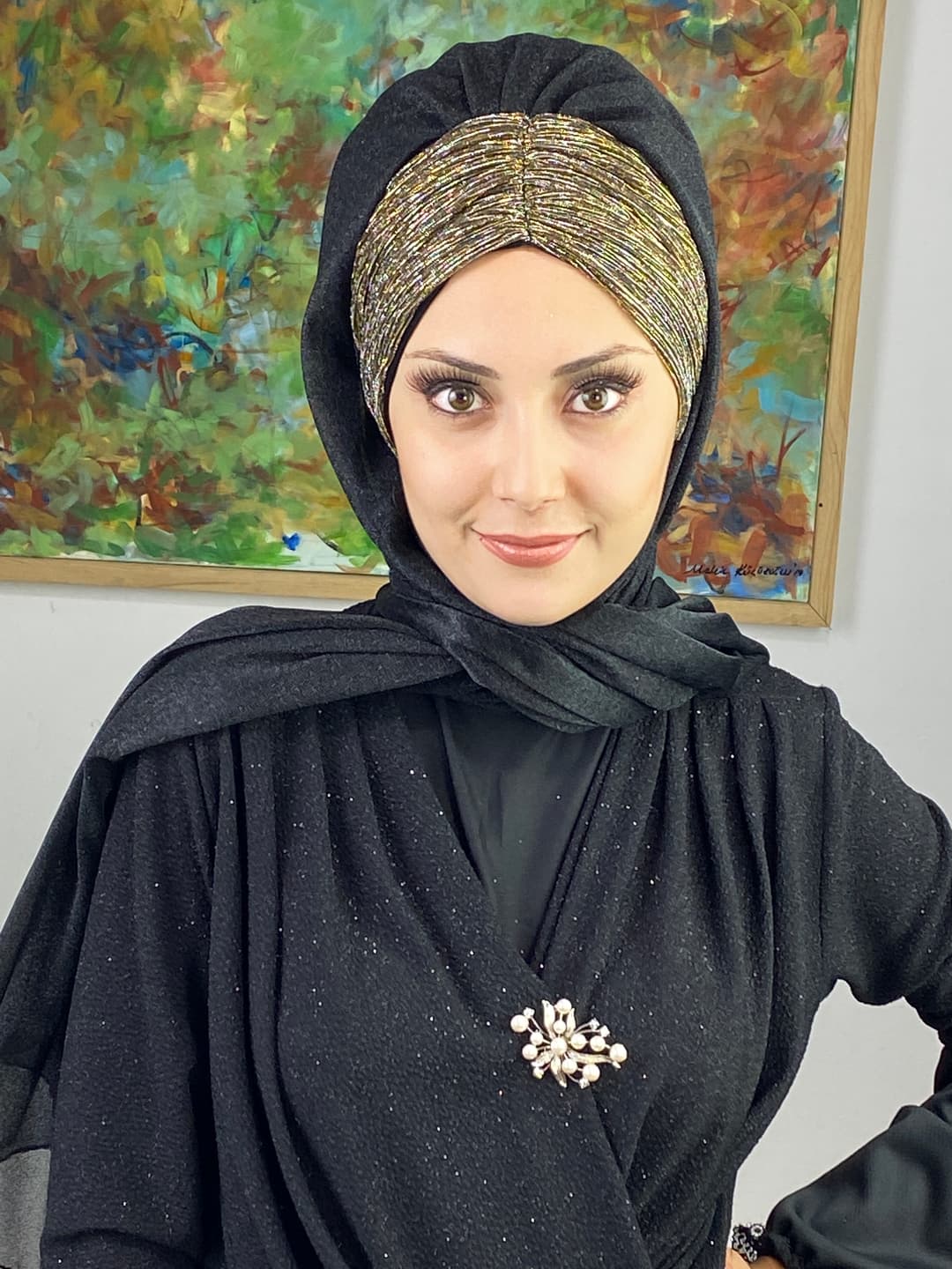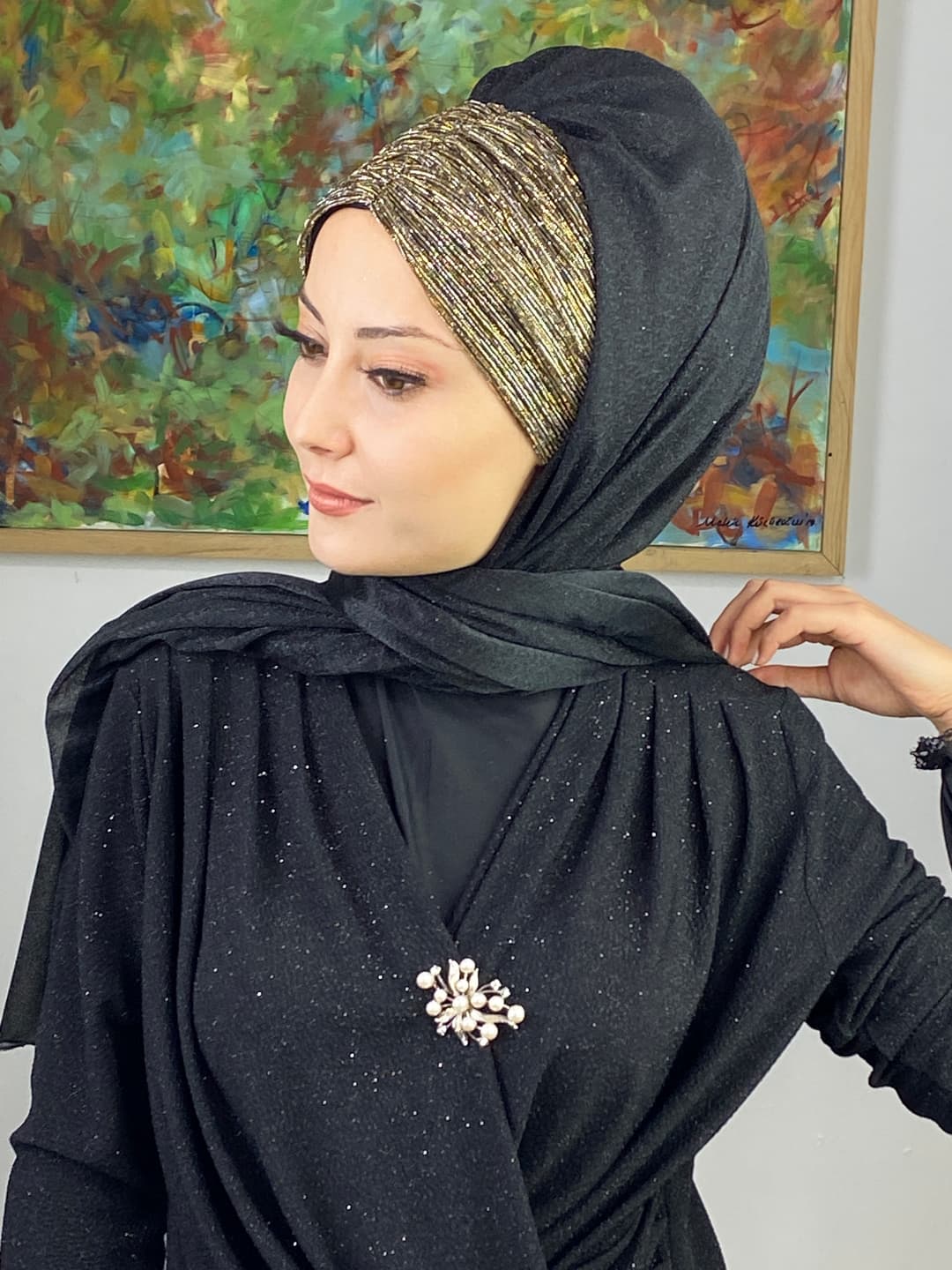 Çift Renkli Sultan Model Simli Şifon Büzgülü Şal – Siyah / Altın Sarısı, ışıltılı zarafet arayan kadınların vazgeçilmezi olmaya aday.