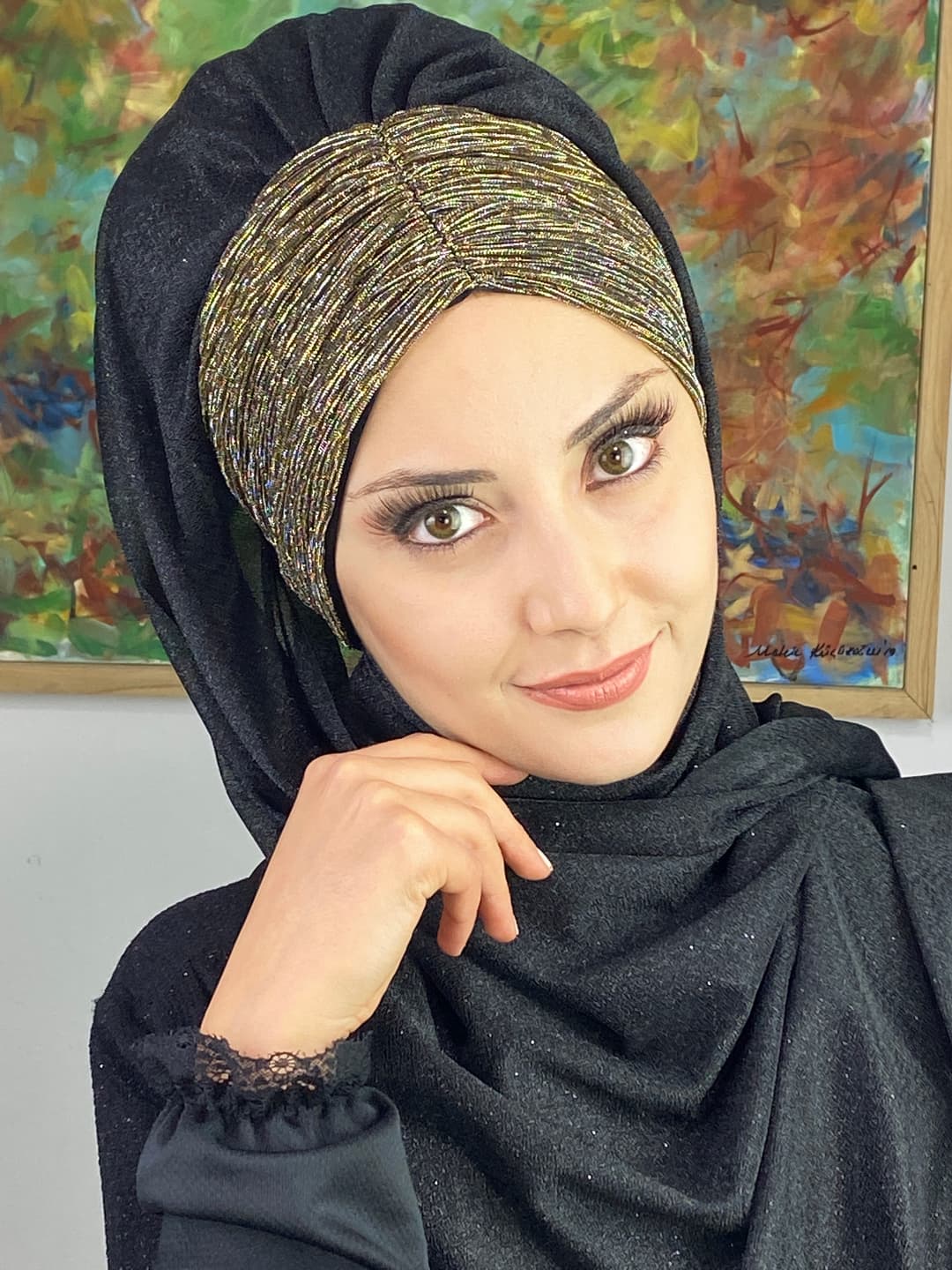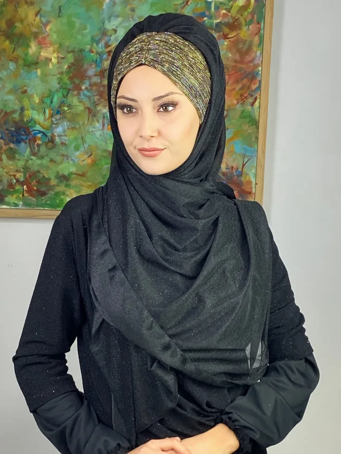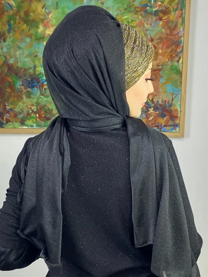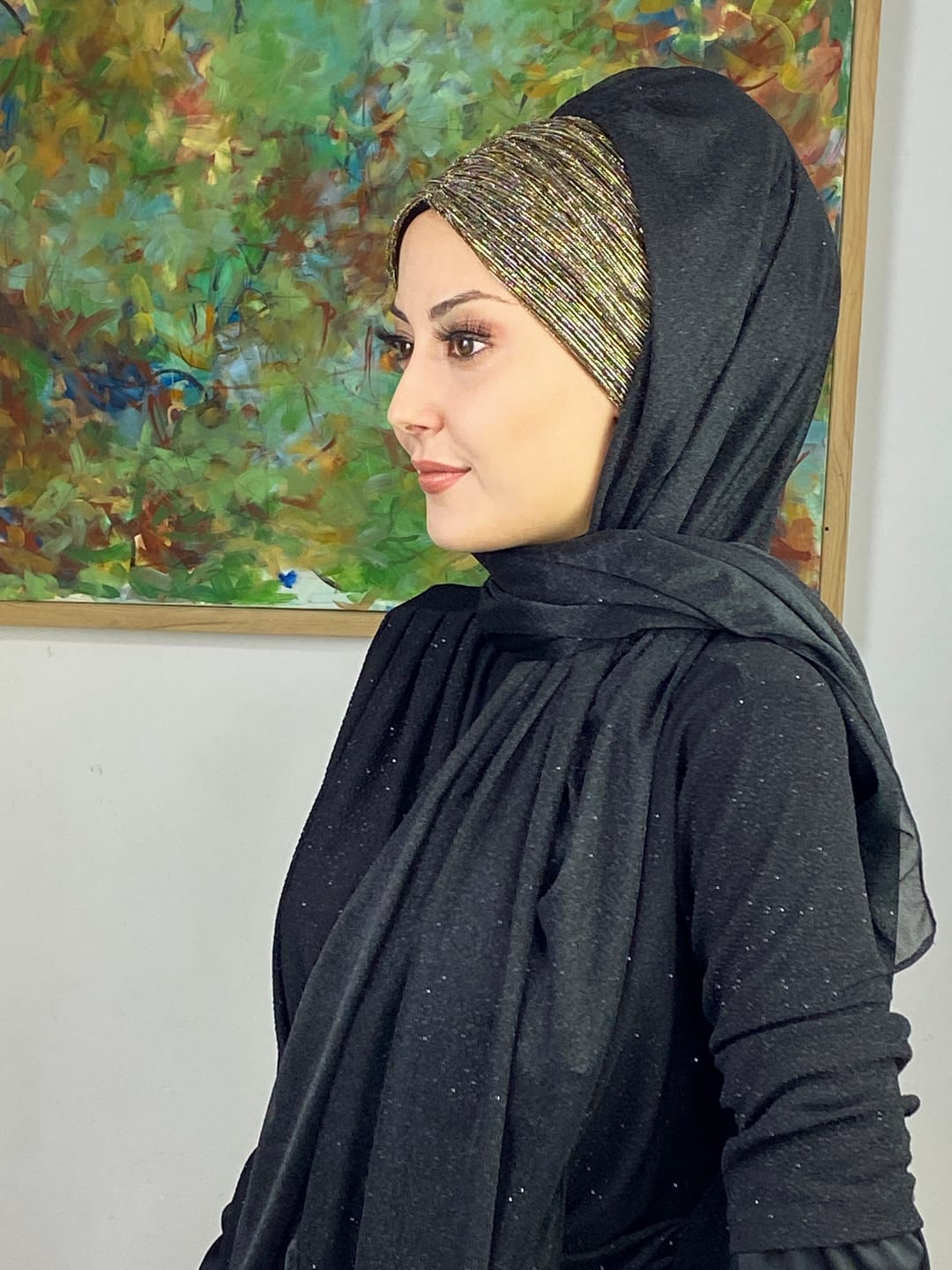 Çift Renkli Sultan Model Simli Şifon Büzgülü Şal – Siyah / Altın Sarısı, ışıltılı zarafet arayan kadınların vazgeçilmezi olmaya aday.