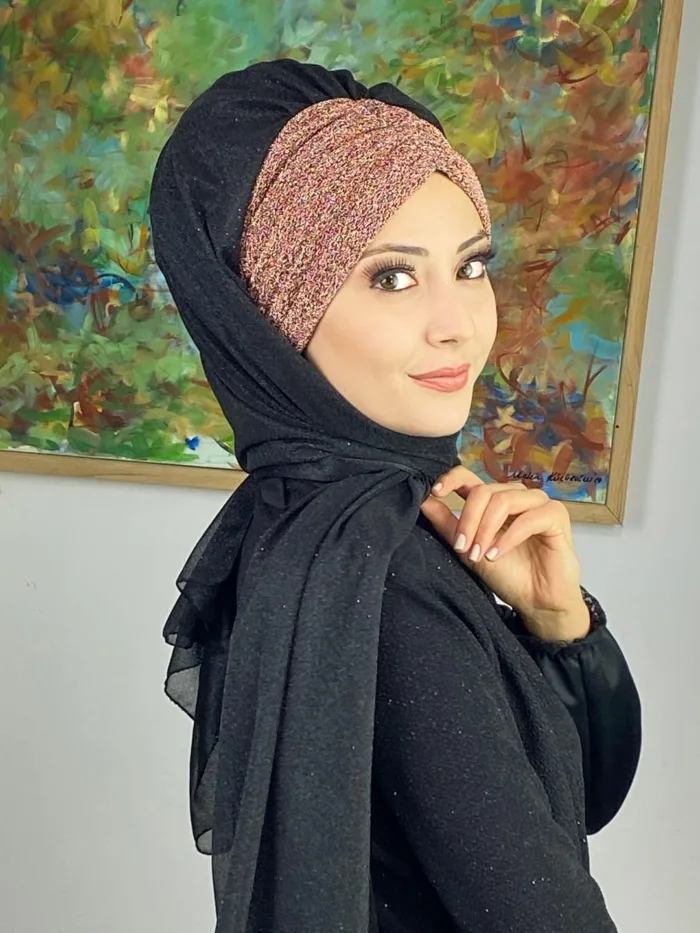 Çift Renkli Sultan Model Simli Şifon Büzgülü Şal – Siyah / Bakır