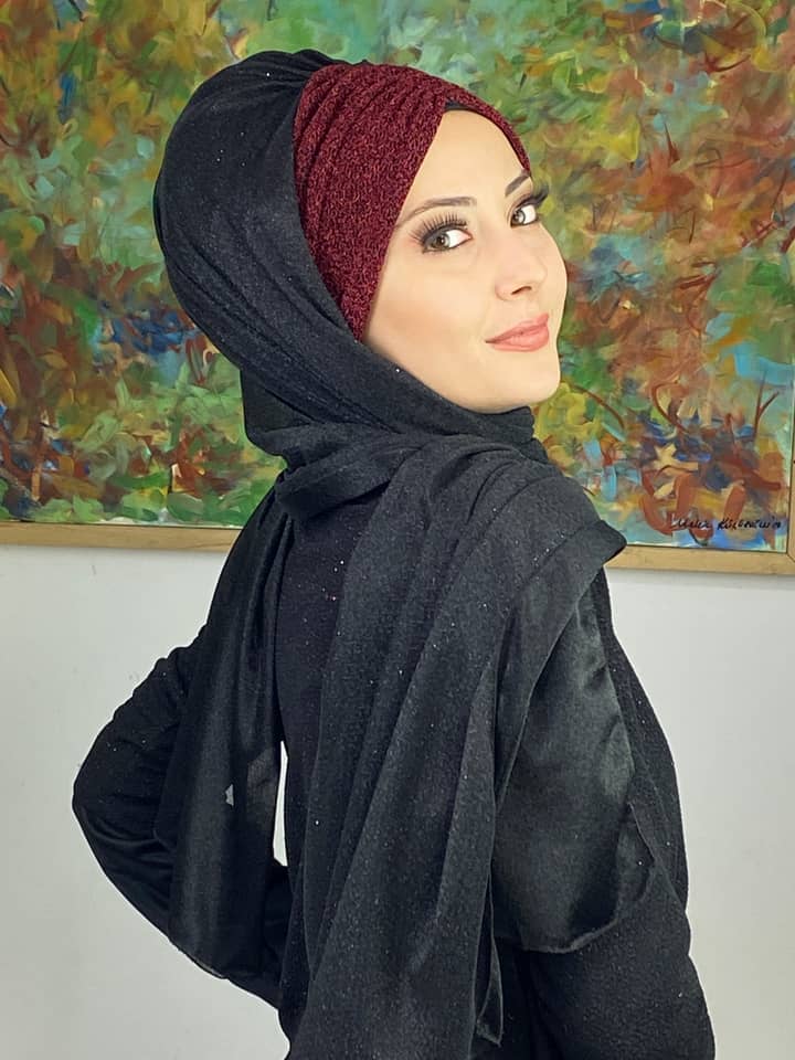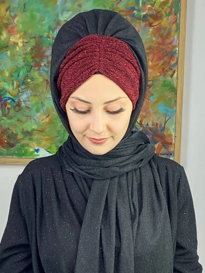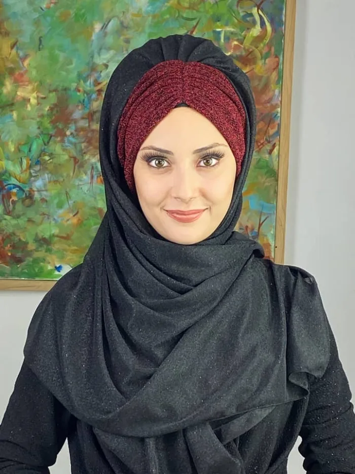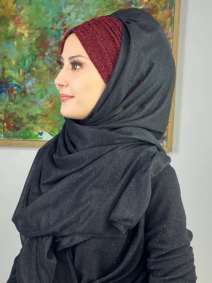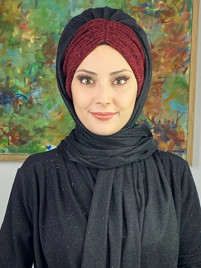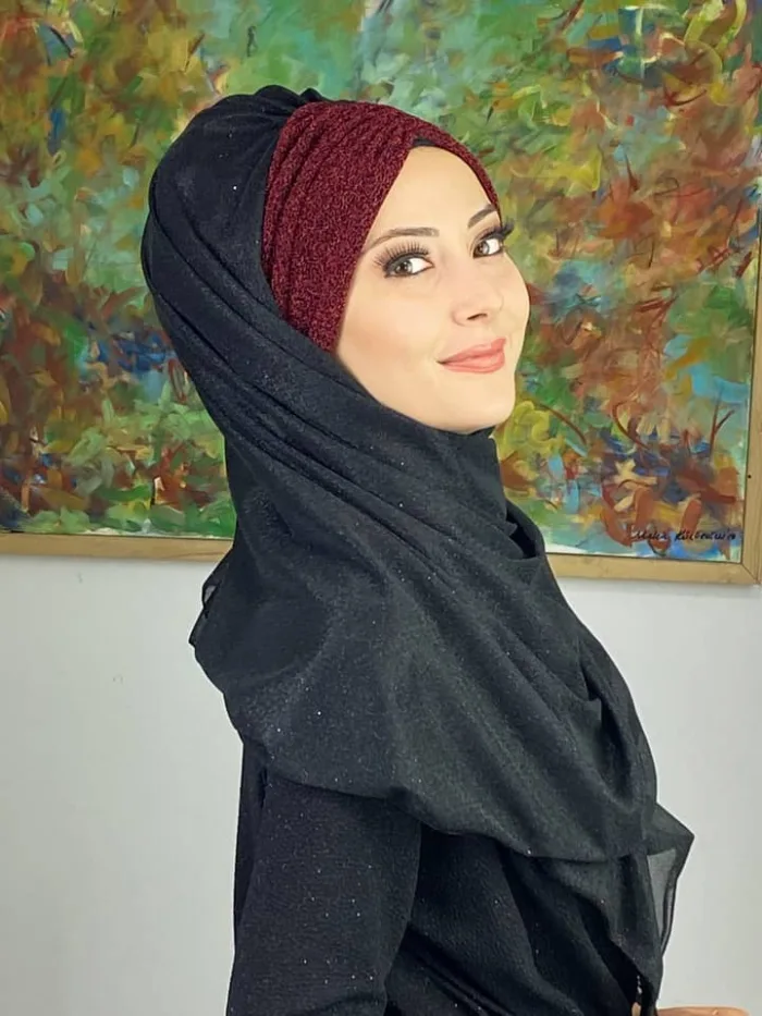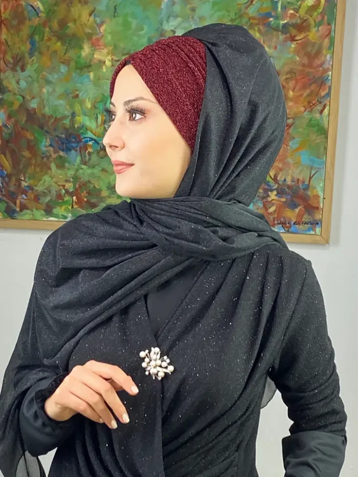 Çift Renkli Sultan Model Simli Şifon Büzgülü Şal – Siyah / Bordo, klasik çizgilere modern bir dokunuş katmak isteyen kadınların ilk tercihi.