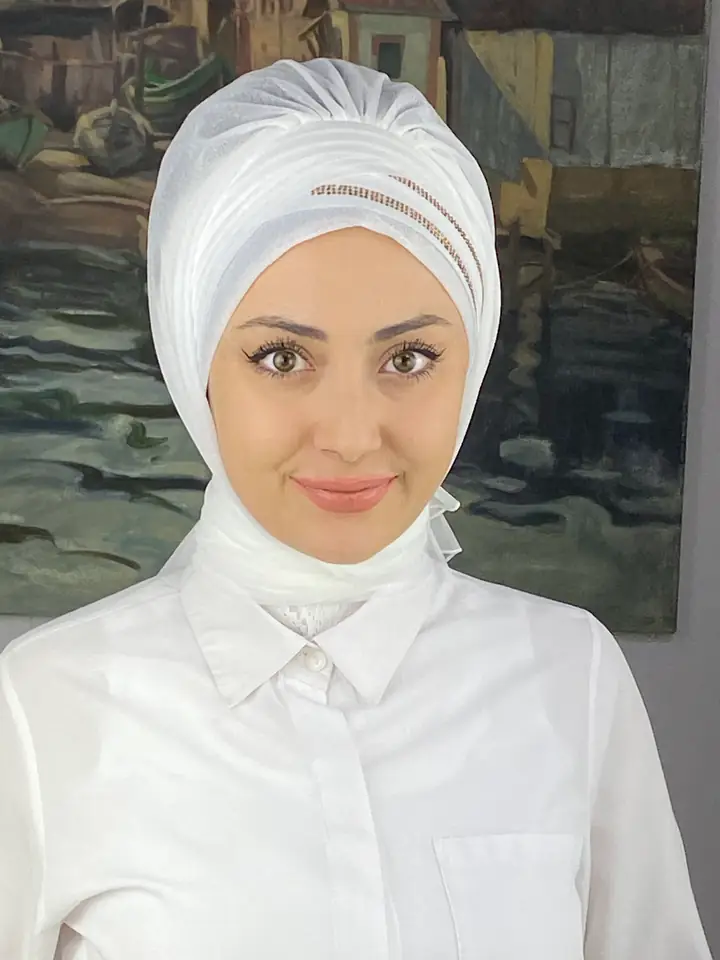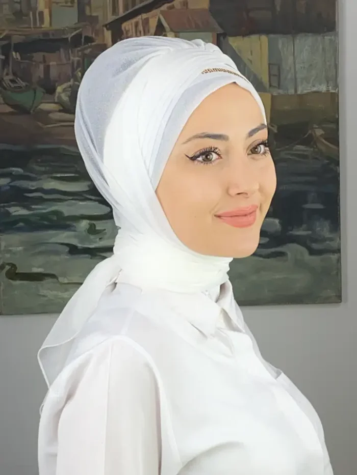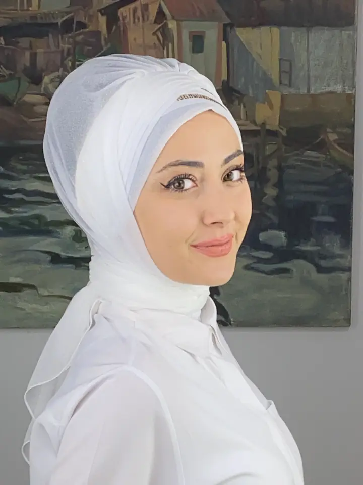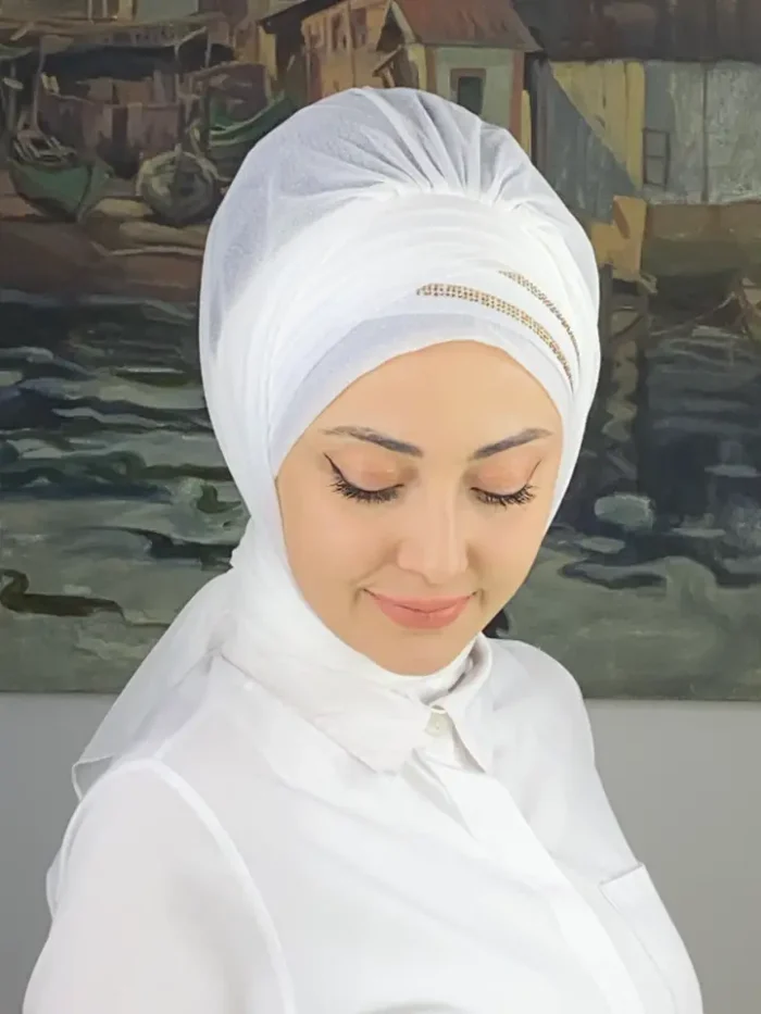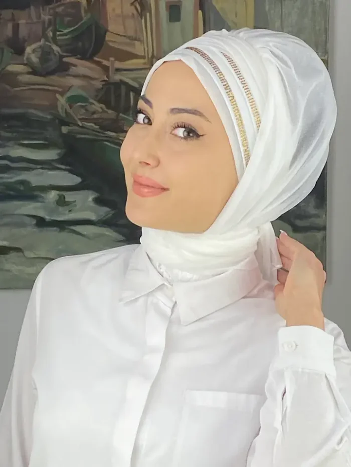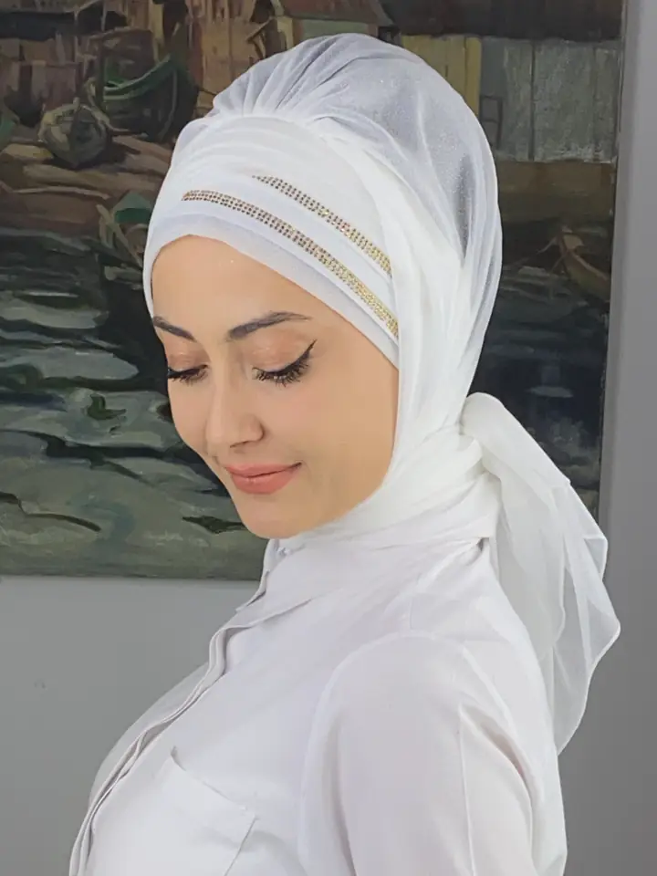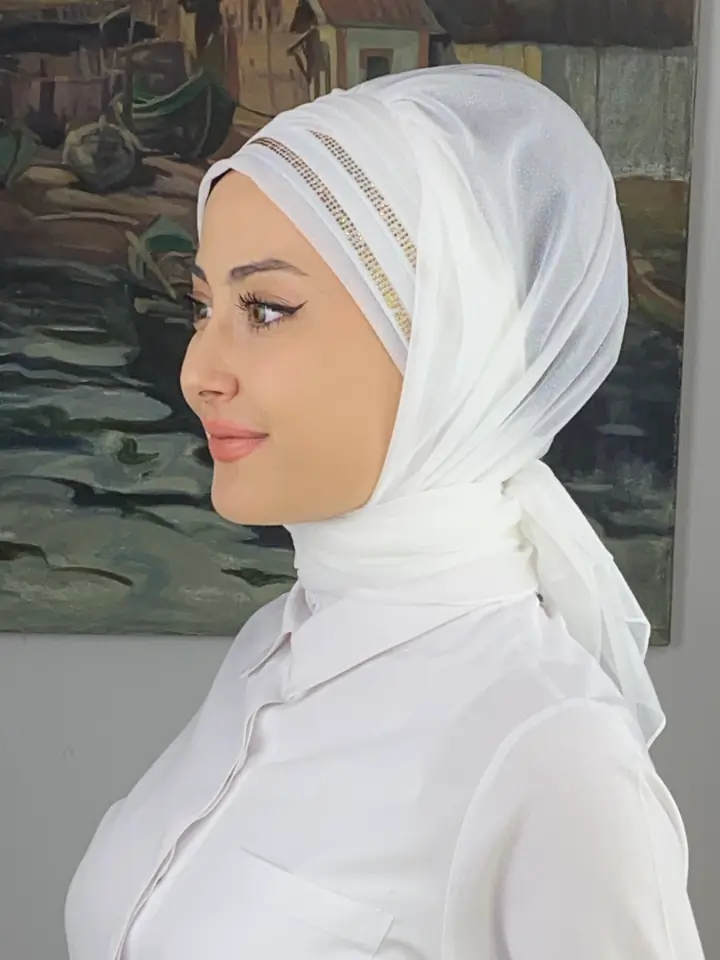 Nefes alan simli şifon kumaş, başta ağırlık hissi oluşturmaz. Çok drapeli formu sayesinde kolay şekil alır ve iğnesiz kullanılabilir. Gold taş süslemeleri, beyazın sadeliğine zarif bir ışıltı kazandırır.