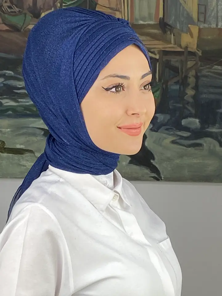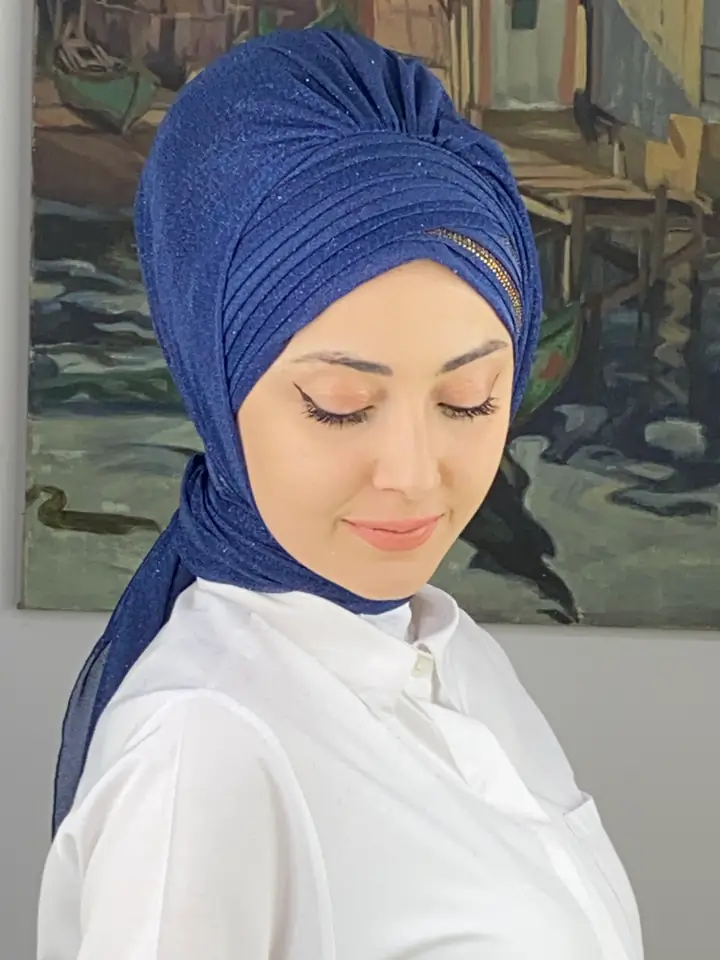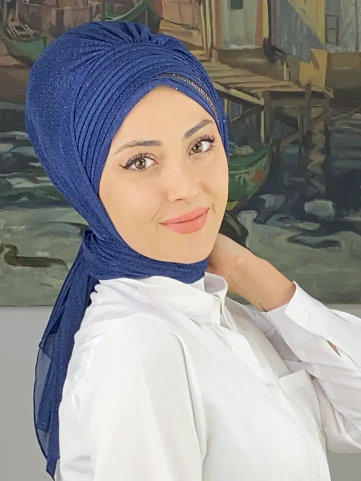 Koyu lacivert, her dönemin en zarif ve güçlü rengidir. Çırağan Çok Drapeli Gold Taşlı Simli Şifon Hazır Şal – Koyu Lacivert, bu klasik tonu gold taşlarla modern bir ışıltıya dönüştürüyor.