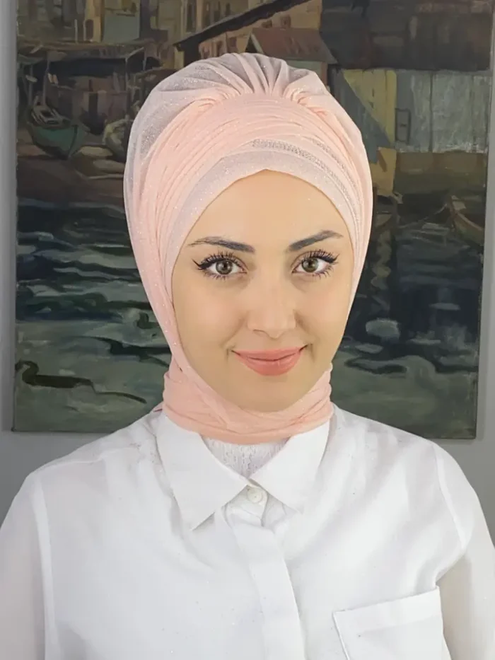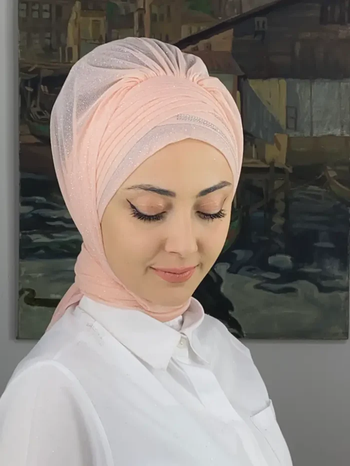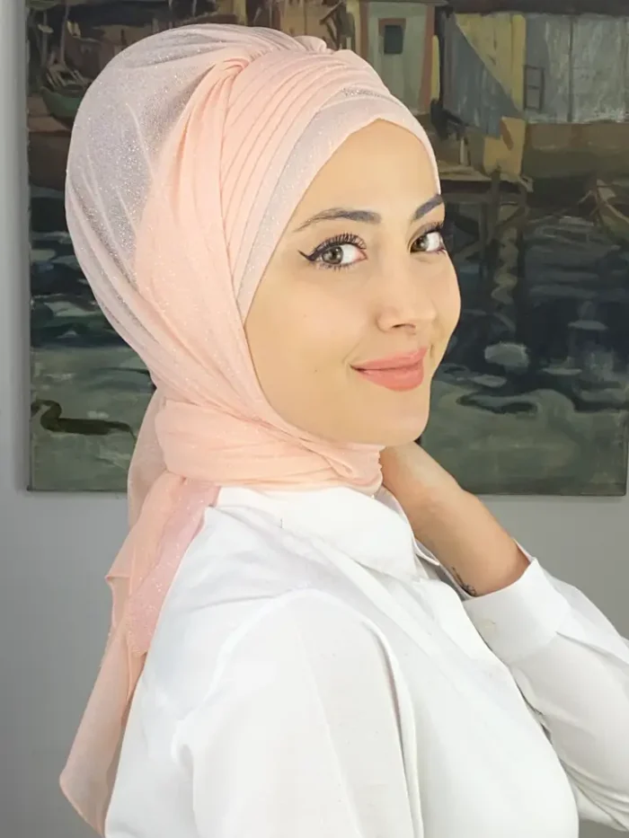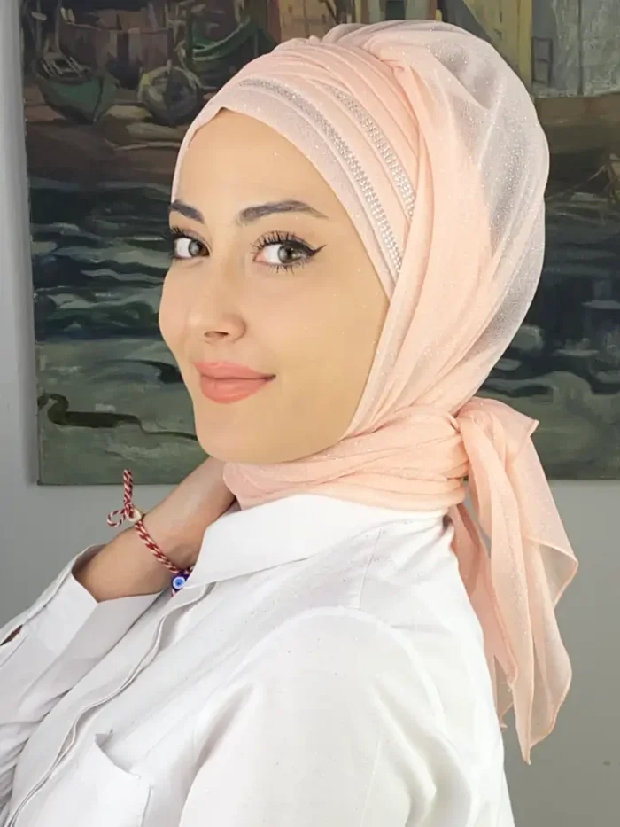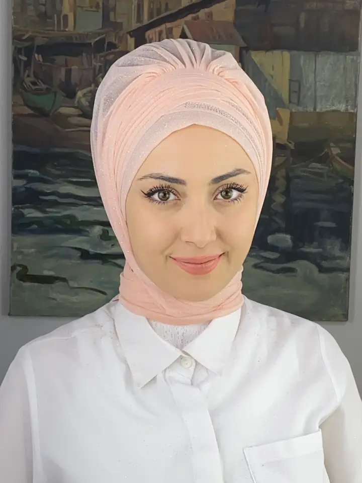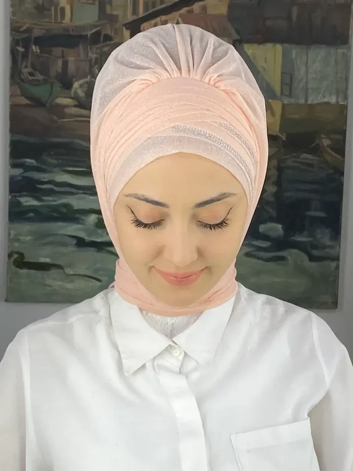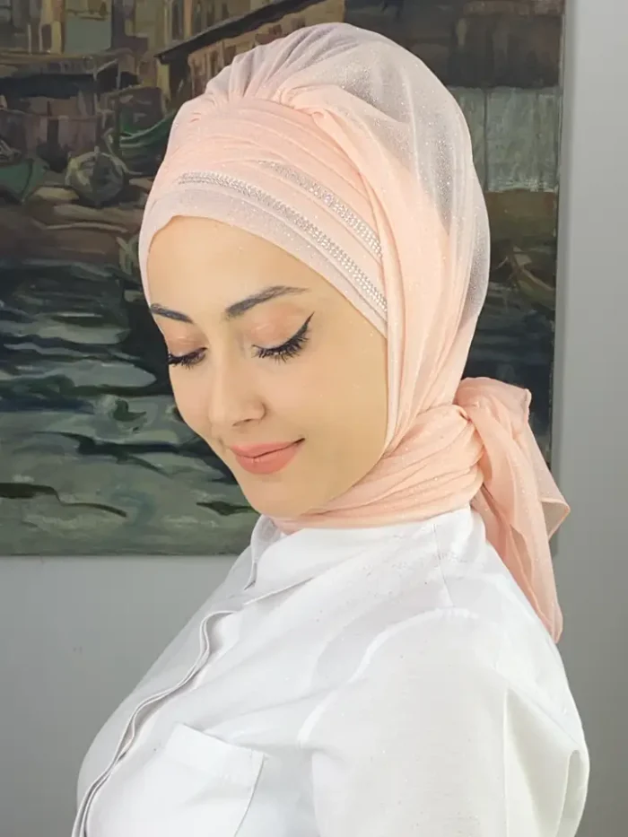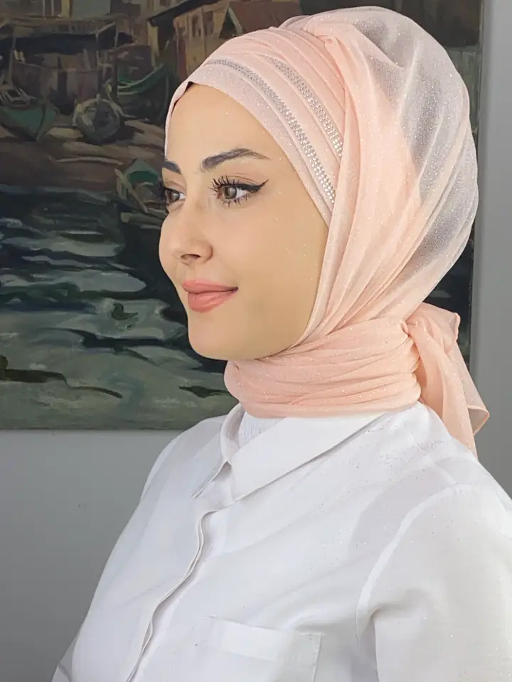 Çırağan Çok Drapeli Gümüş Taşlı Simli Şifon Hazır Şal – Açık Somon