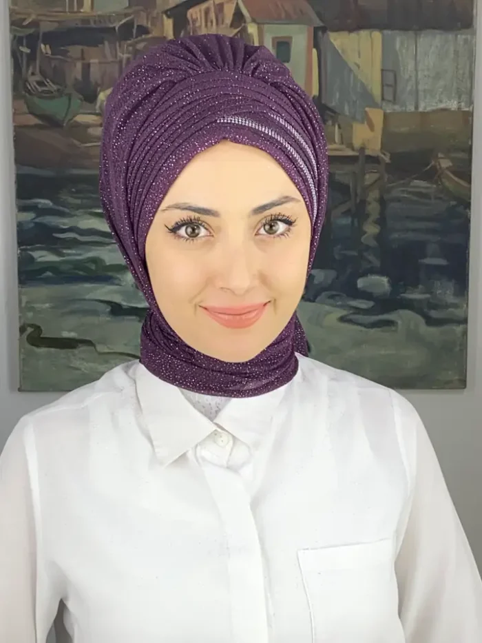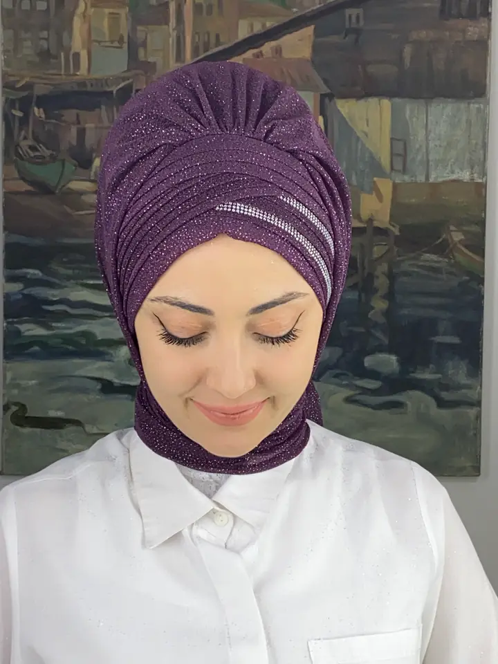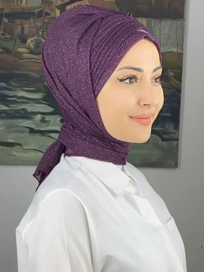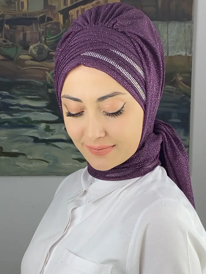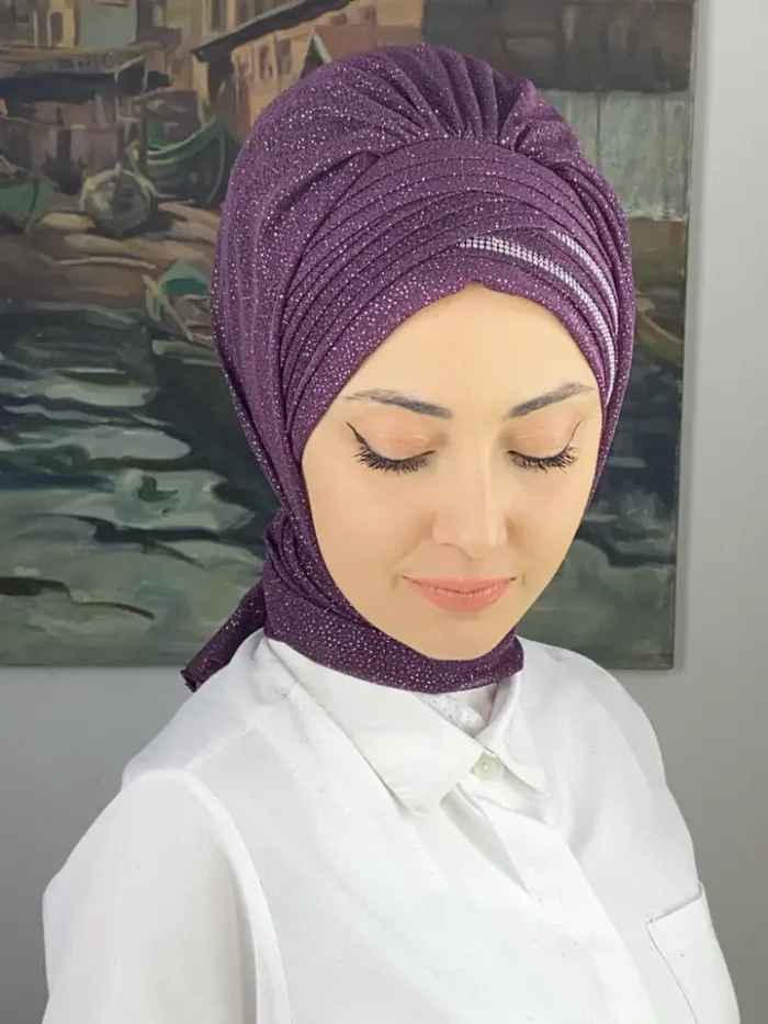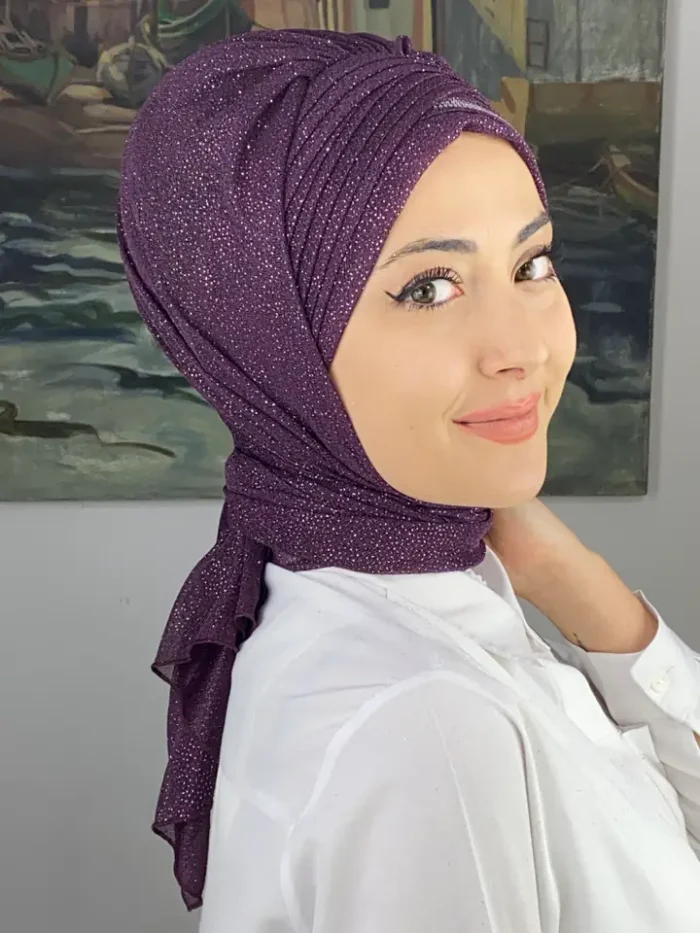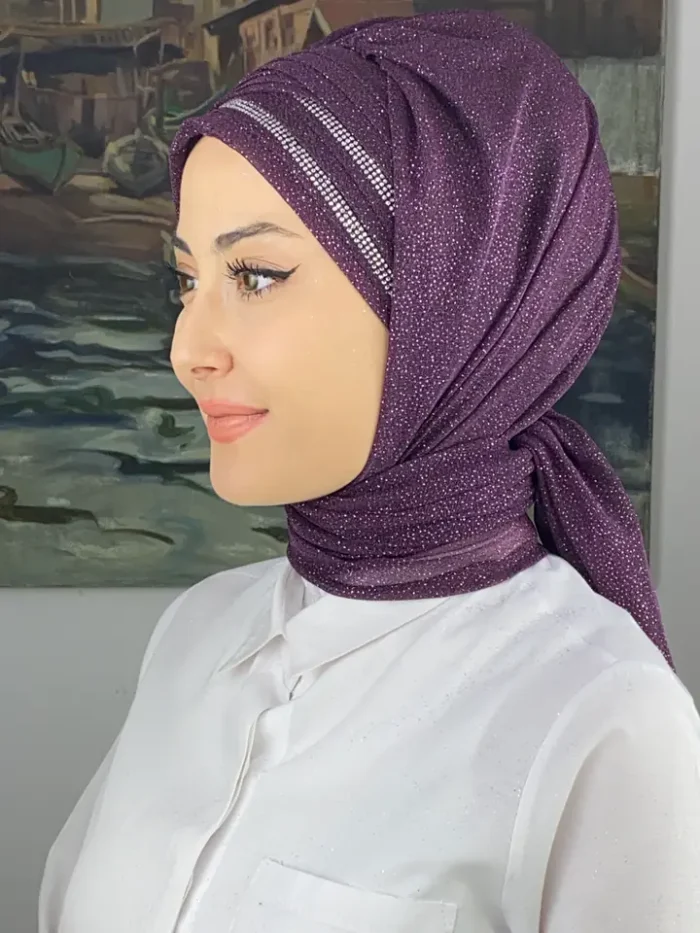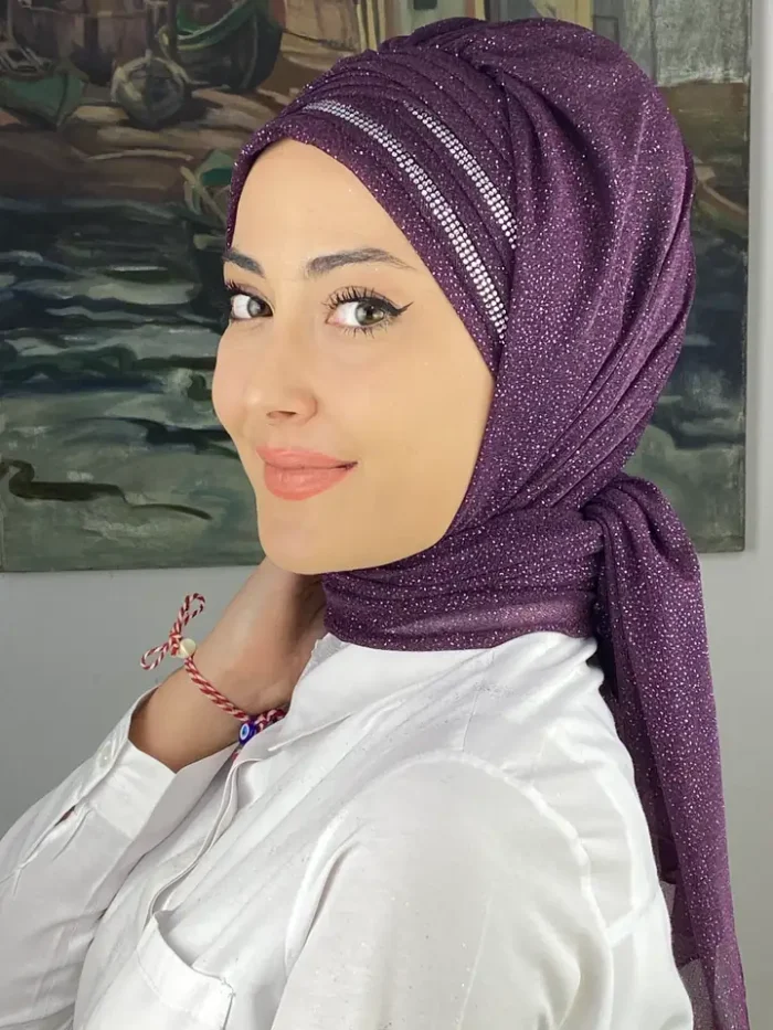 Yüksek kaliteli simli şifon kumaşı, hafif ama dayanıklı yapısıyla gün boyu konfor sağlar. Başta ağırlık yapmadan, terletmeden rahat bir kullanım sunar. Çok drapeli formu sayesinde başta dengeli bir düşüş sağlar ve iğnesiz kullanım kolaylığı kazandırır. Gümüş taş detayları, morun derin tonlarıyla mükemmel uyum sağlayarak ışığı zarifçe yansıtır.