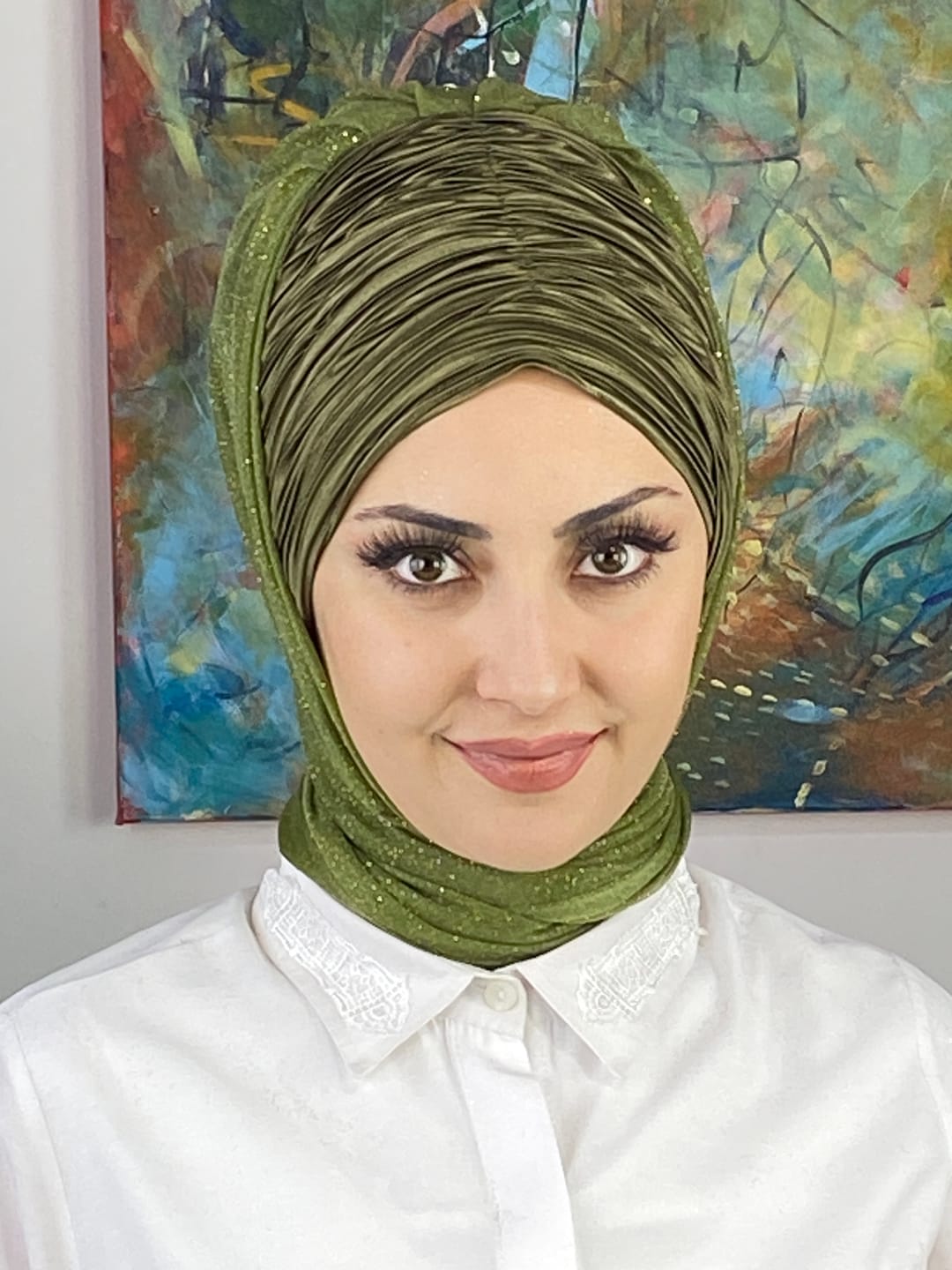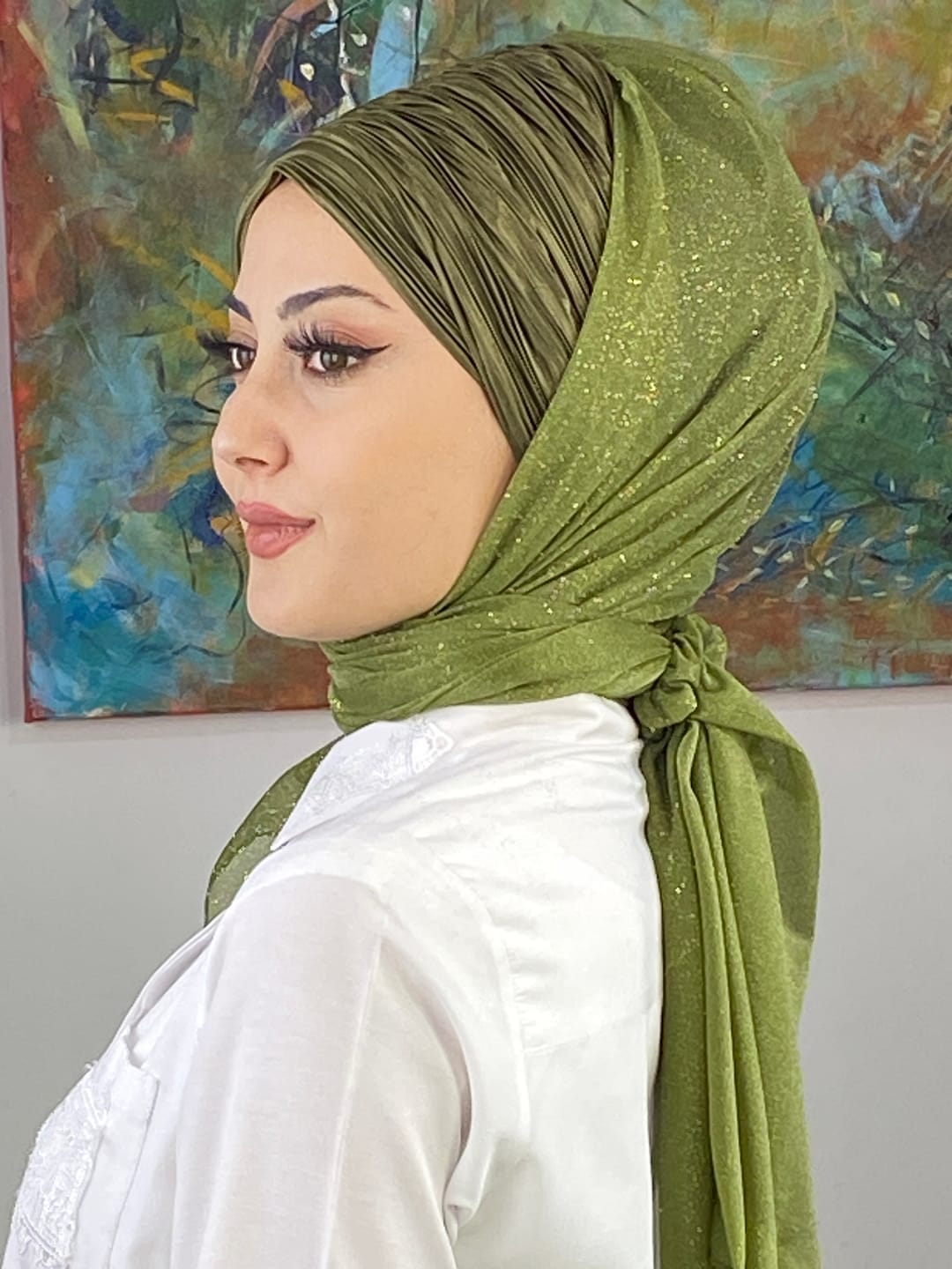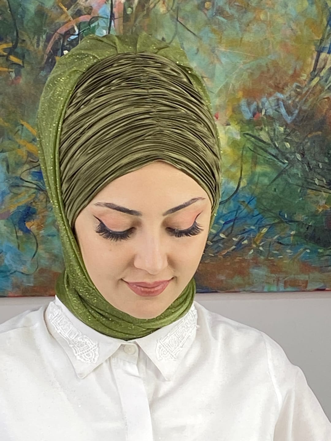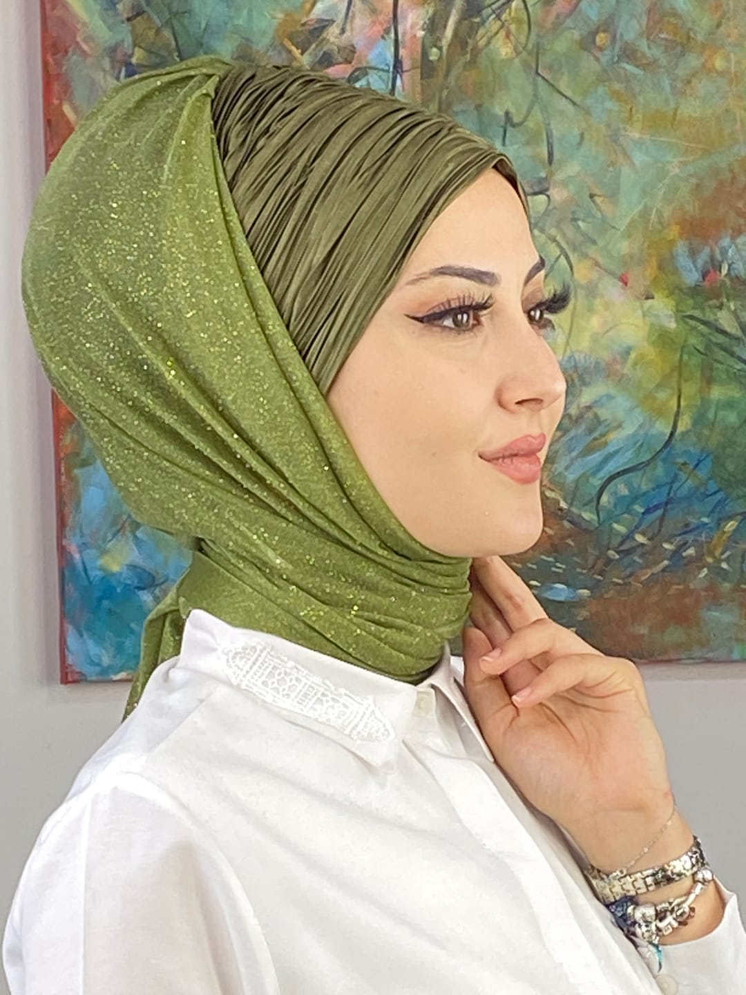 Dilber Model Büzgülü Simli Abiye Şal – Yağ Yeşili 🌿