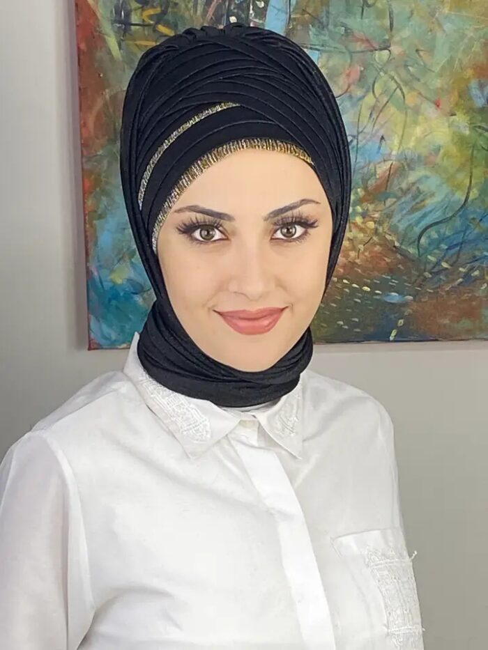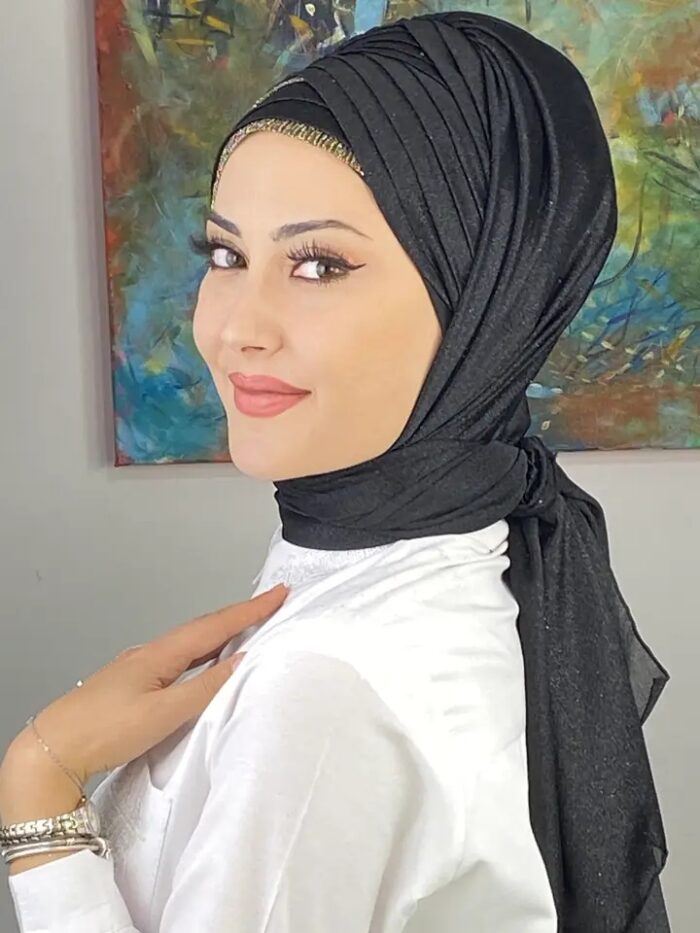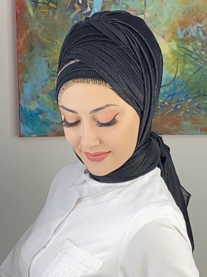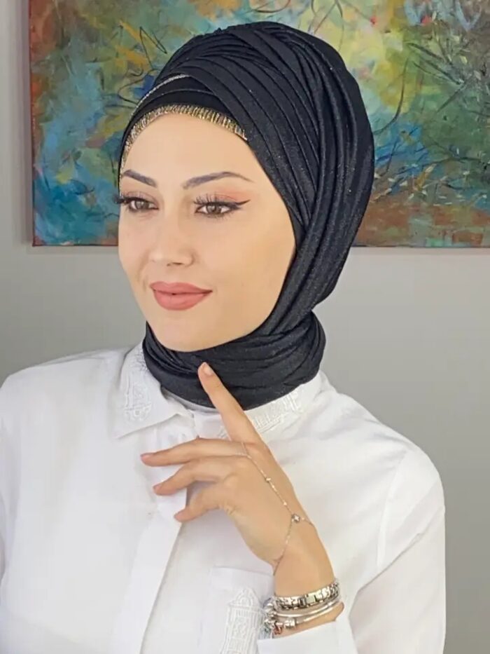 Yüksek kalite simli şifon, nefes alan yapısıyla dört mevsim kullanım sağlar. Drapeli kesim, şekil vermeye gerek kalmadan başta mükemmel bir duruş kazandırır.