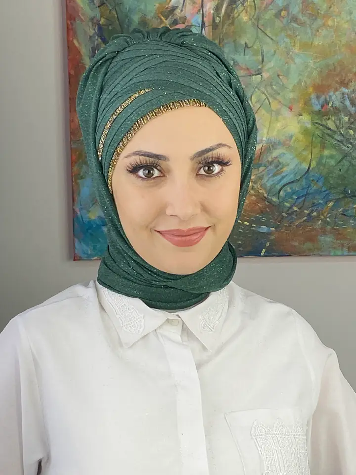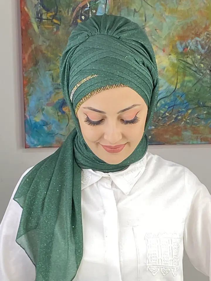 Dilber Model Çok Drapeli Sim Detaylı Şal – Zümrüt Yeşili