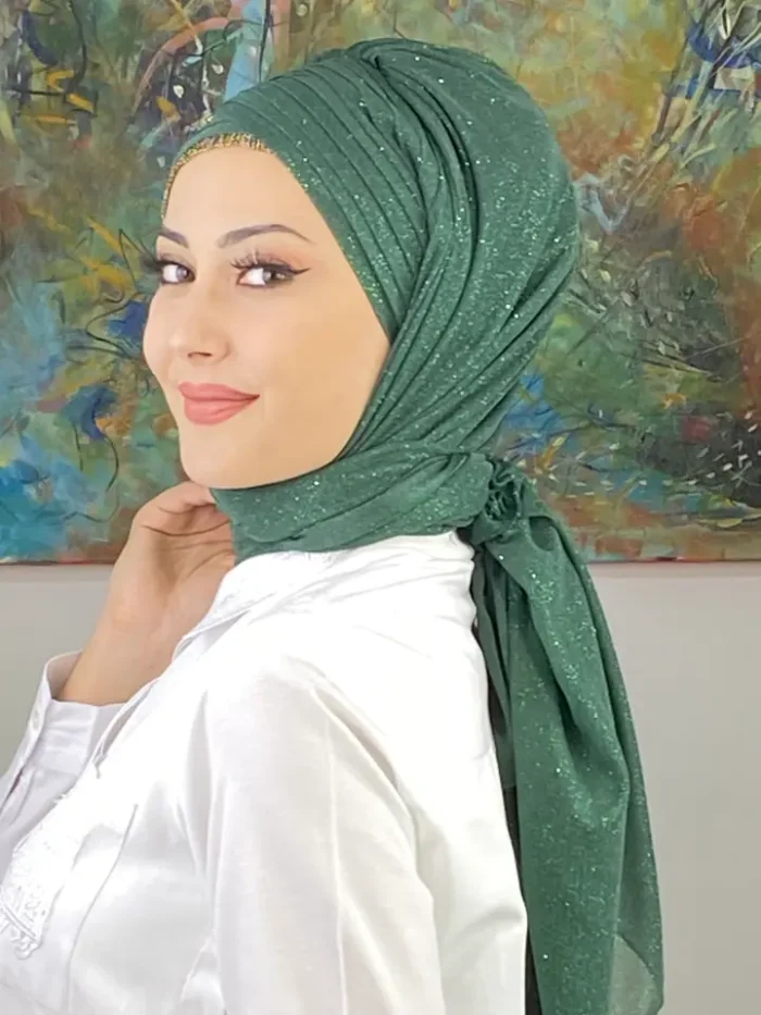Zümrüt yeşili şal, ışıkla buluştuğunda parlak ama göz yormayan bir ışıltı yayar. Düğün ve davetlerde klasik şıklığın vazgeçilmez parçasıdır.