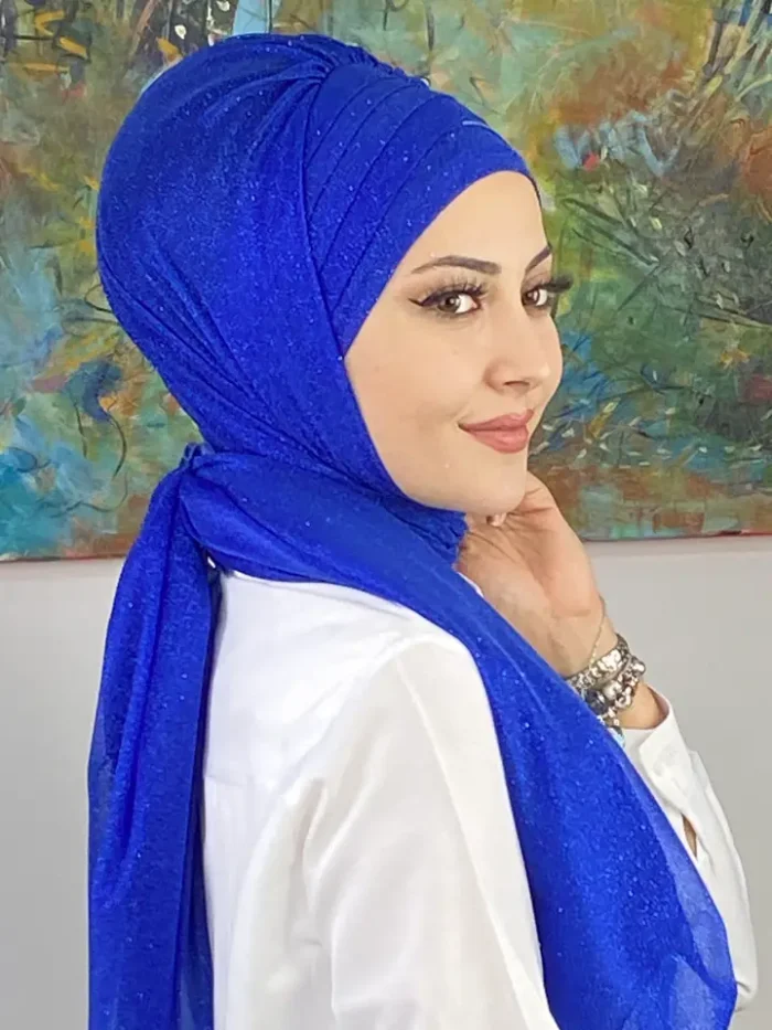 Saks mavi şal, beyaz, gri, krem, gümüş ve lacivert tonlarıyla mükemmel uyum sağlar. Gümüş takılarla birleştiğinde modern bir kontrast oluşturur, inci detaylarla tamamlandığında klasik bir zarafet kazanır. Saten elbiseler, simli abiyeler veya düz renk takımlarla kombinlendiğinde şalın rengi daha da ön plana çıkar.