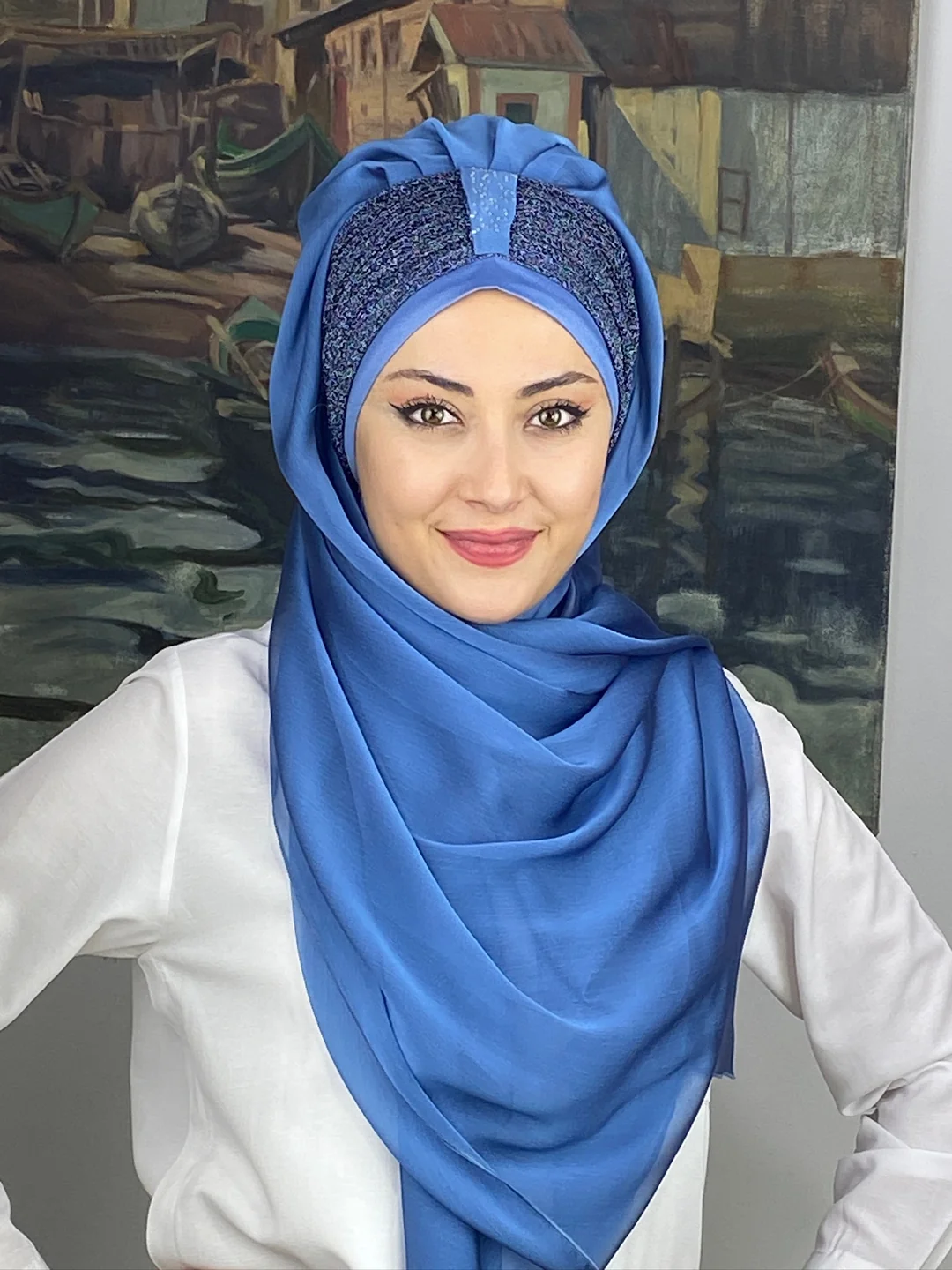Şalın kumaşında kullanılan Fransız şifon, hafif, dökümlü ve nefes alan yapısıyla bilinir. Cildi rahatsız etmez, terletmez ve gün boyu konfor sağlar. Drape formu sayesinde şalın her detayı başta kusursuz durur; kaymaz, bozulmaz.