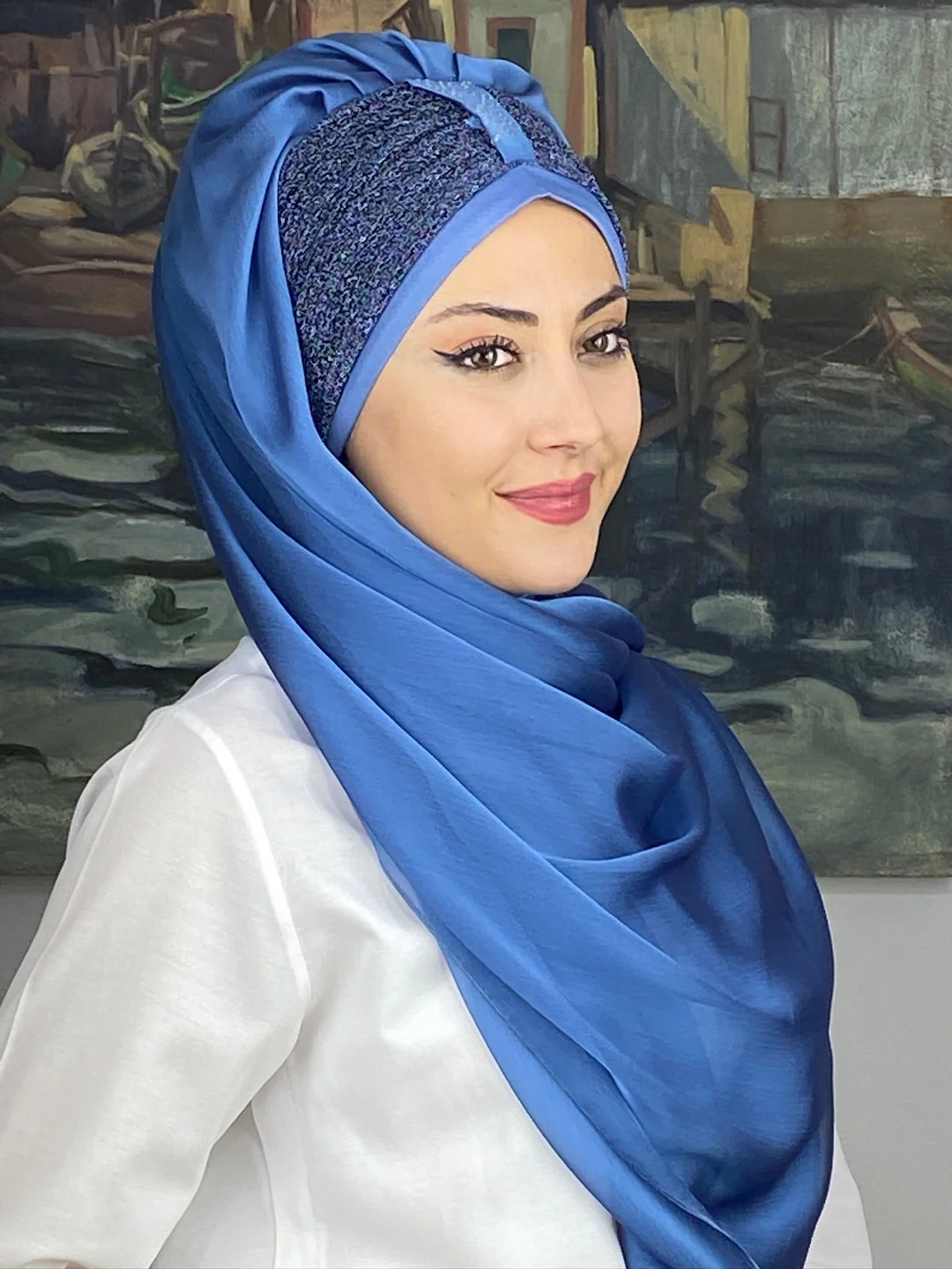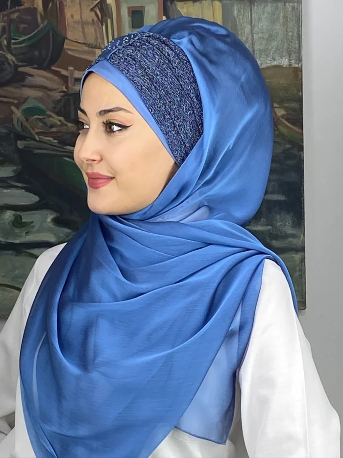 İndigo mavisinin derin tonları, asil ve sofistike bir zarafet sunuyor. Fransız Çapraz Drape Detaylı Abiye Şal – İndigo Mavi, klasik abiye anlayışına modern bir yorum getiriyor. Zarif drape detaylarıyla şekillendirilen bu şal, her bakışta zarif bir akış hissi uyandırıyor.