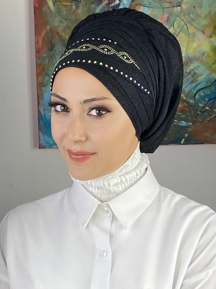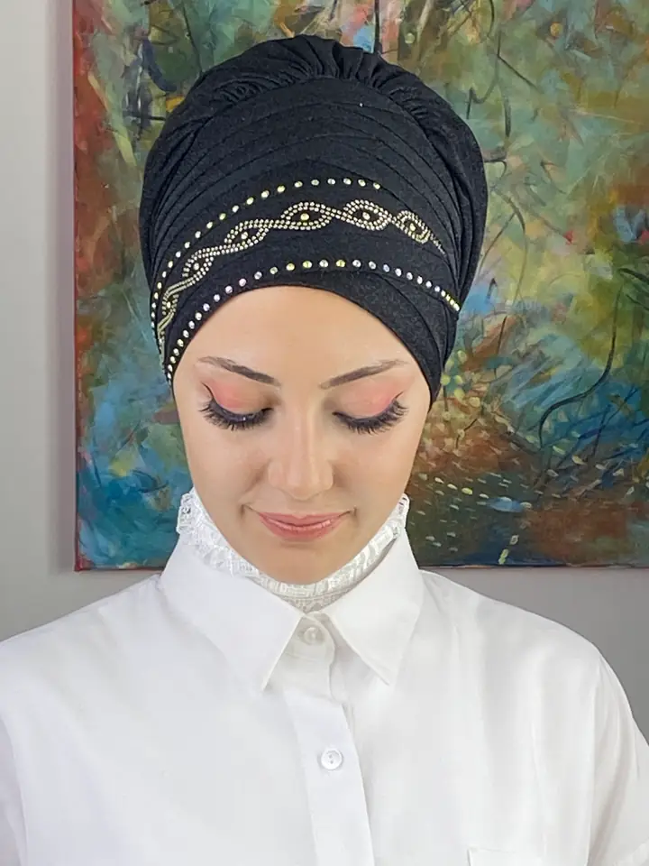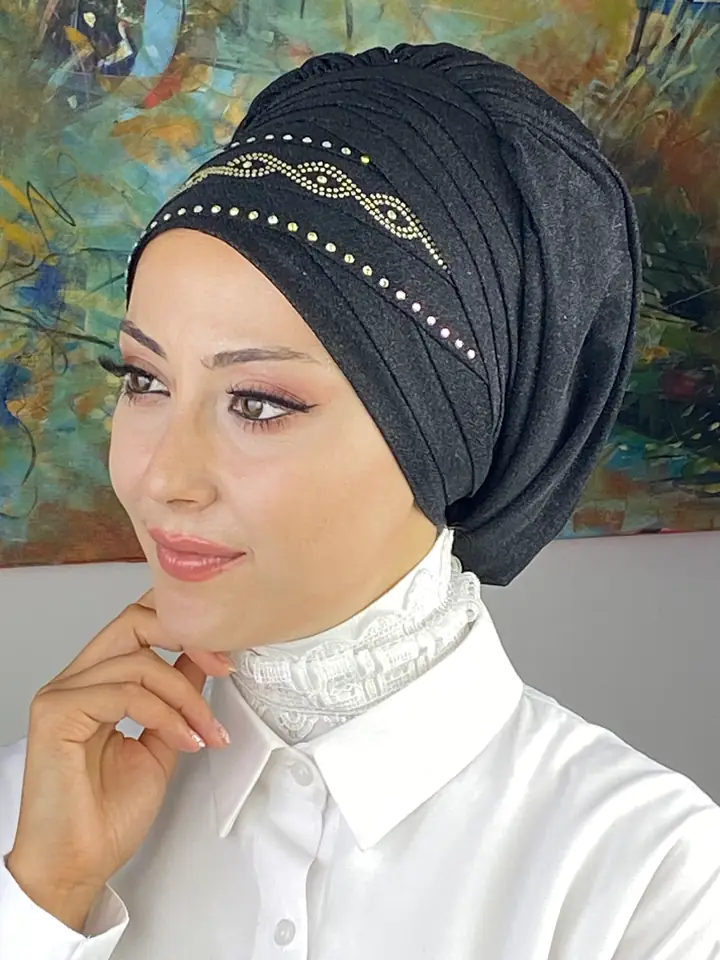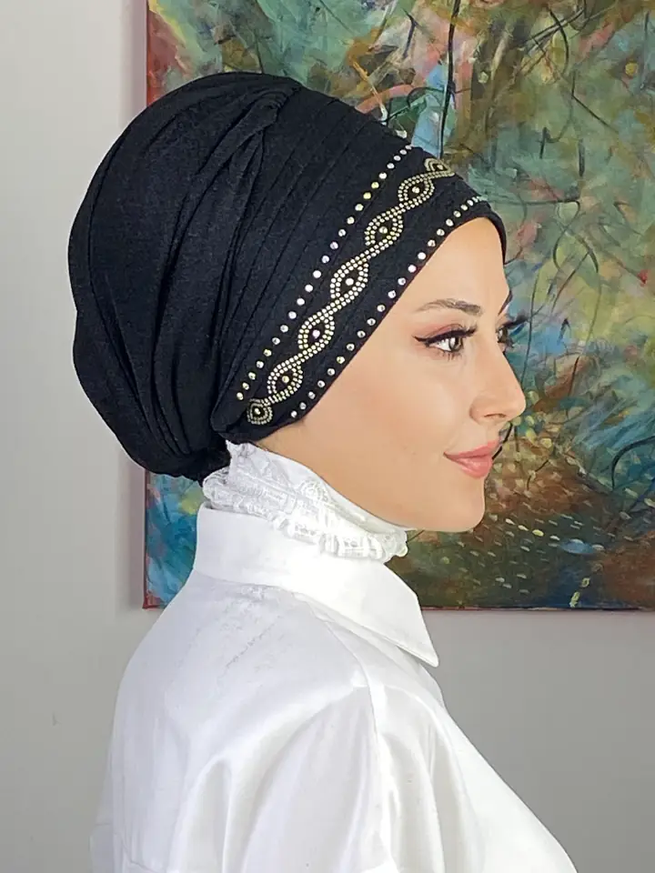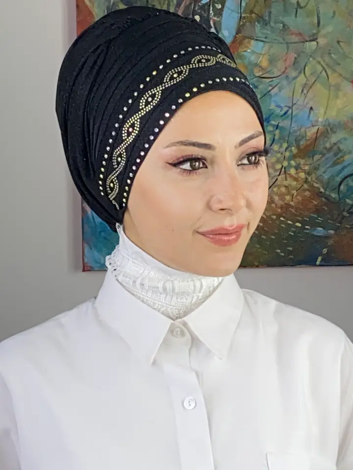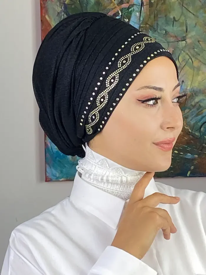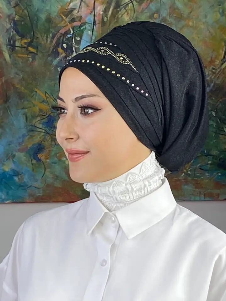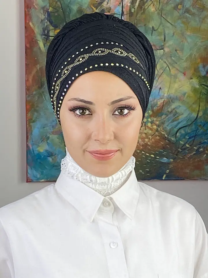 Siyah, her gardırop için vazgeçilmez bir renktir ve bu şal, siyahın zarafeti ile altın taşların ışıltısını mükemmel bir şekilde birleştirir. Her yaşa ve cilt tonuna uyum sağlar. Şıklığı ve zarafetiyle öne çıkan bu bone şal, sizi her ortamda en şık kişi yapacaktır. Şalın kuşgözü modeli, klasik bir tasarımı modern dokunuşlarla harmanlayarak, her detayıyla göz alıcı bir şıklık sunar.