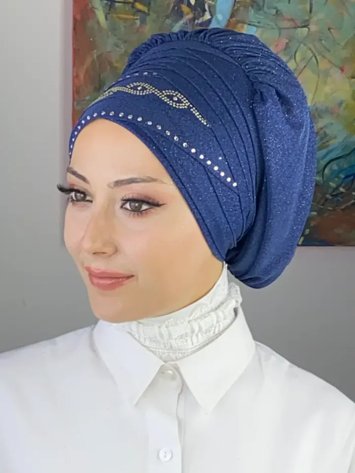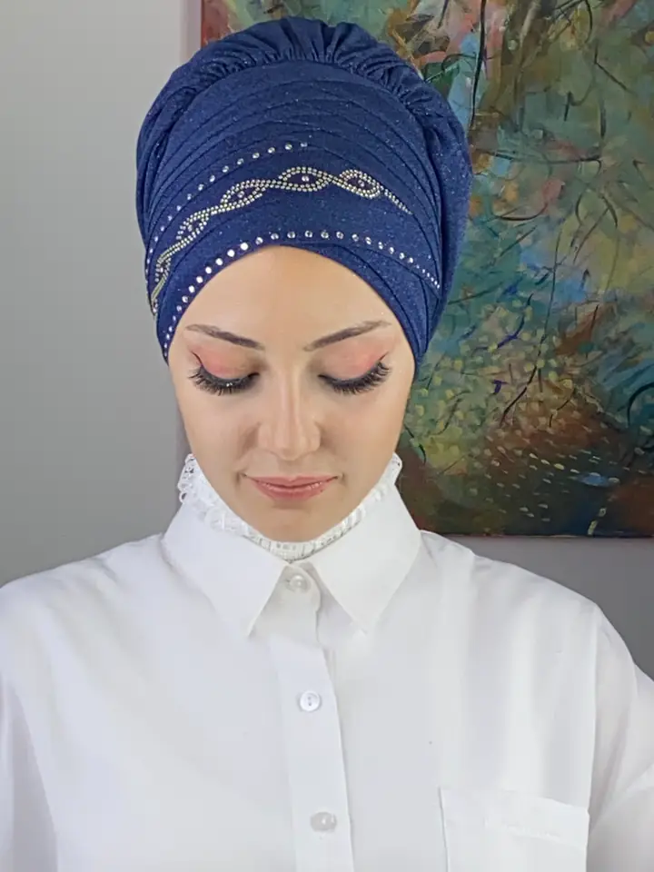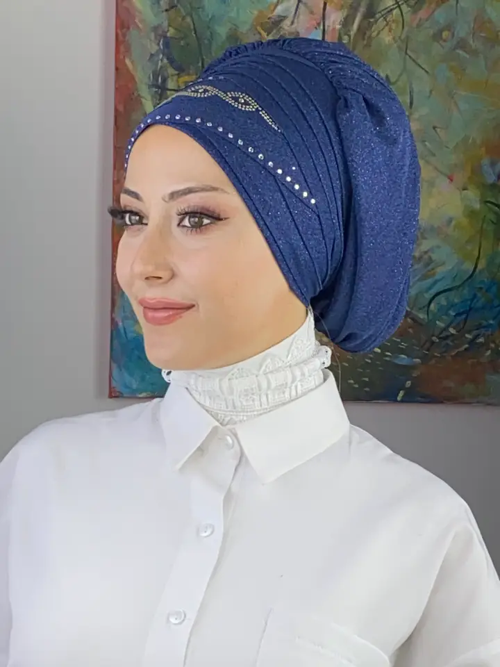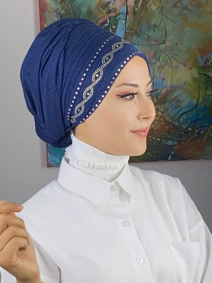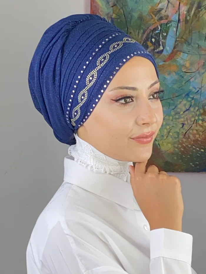 Şıklığınızı tamamlamak için Gold Taşlı Kuşgözü Model Gümüş Hologramlı Simli Şifon Bone Şal – Lacivert‘i hemen sipariş edin!