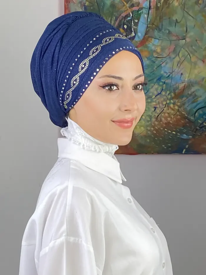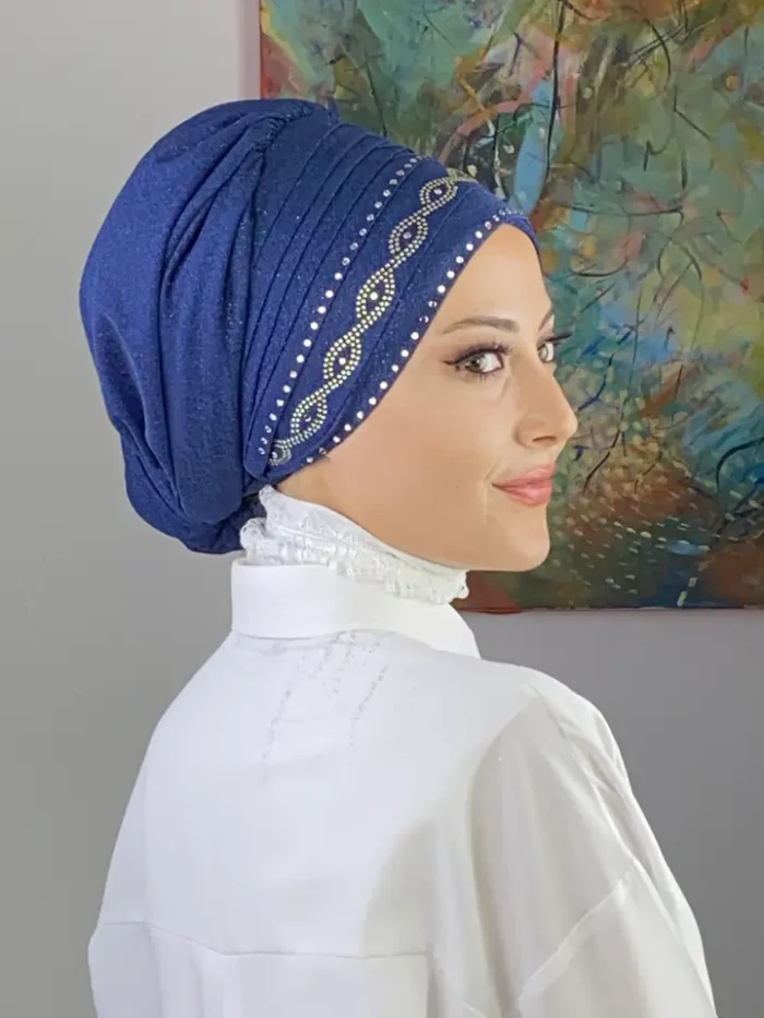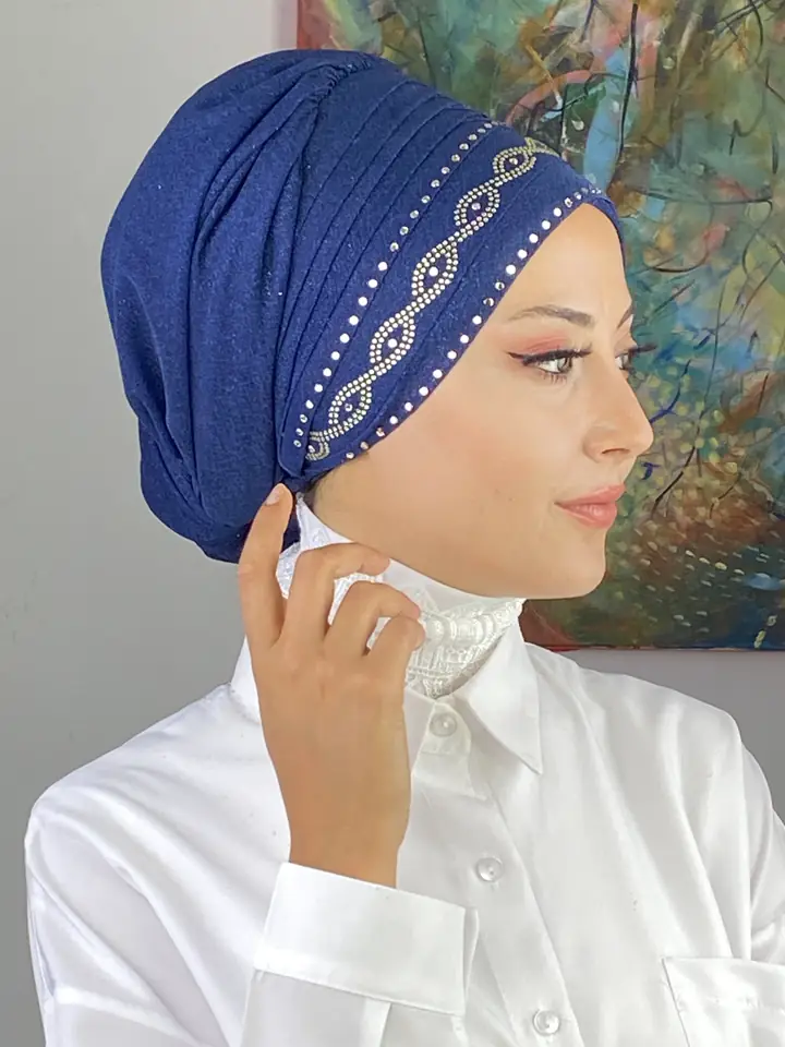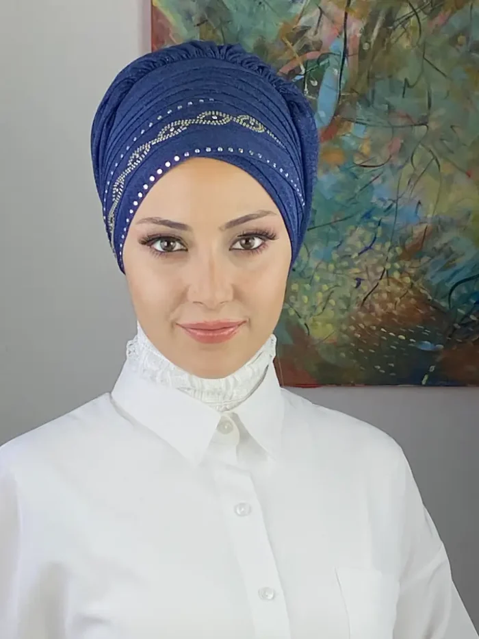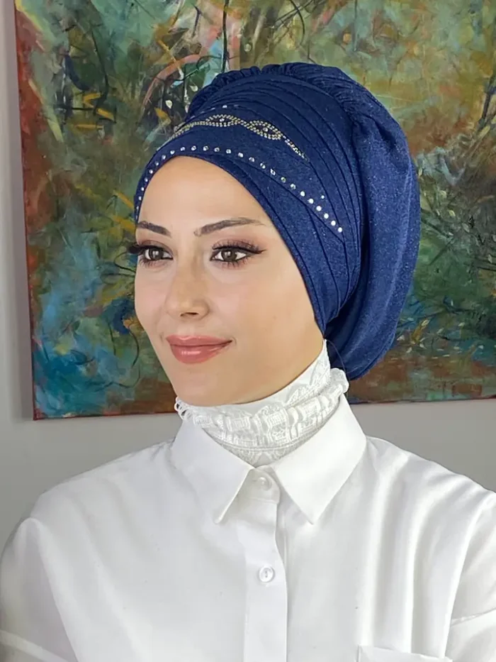 Şıklığınızı tamamlamak için Gold Taşlı Kuşgözü Model Gümüş Hologramlı Simli Şifon Bone Şal – Lacivert‘i hemen sipariş edin!