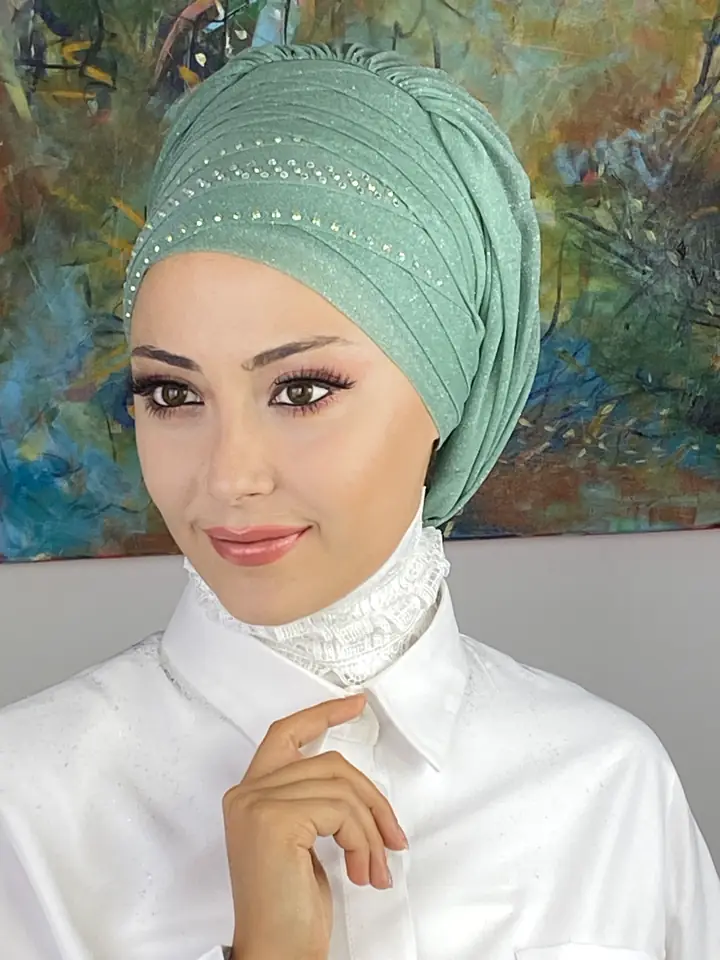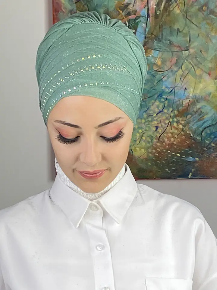 Mint yeşili şıklığını yakalamak için Gümüş Hologram Taşlı Üç Şeritli Bone Şal – Mint Yeşili’yi hemen sipariş edin!