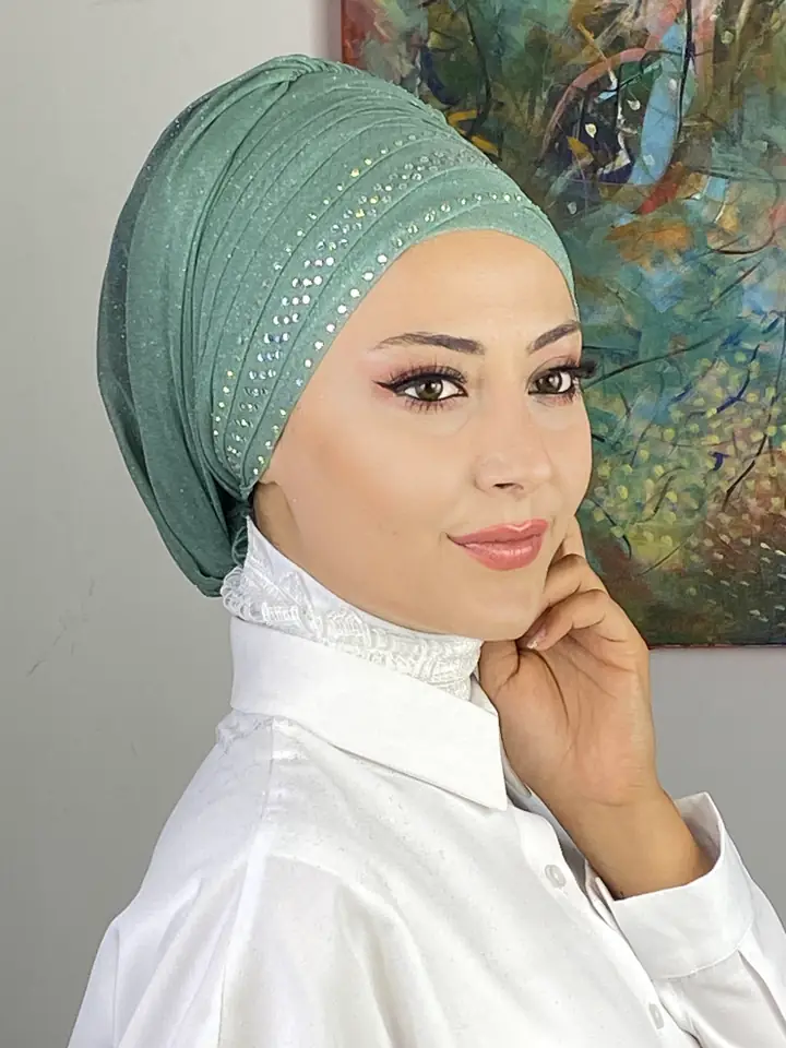Gümüş Hologram Taşlı Üç Şeritli Bone Şal – Mint Yeşili