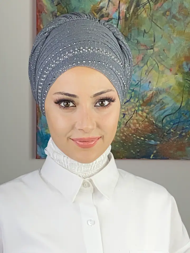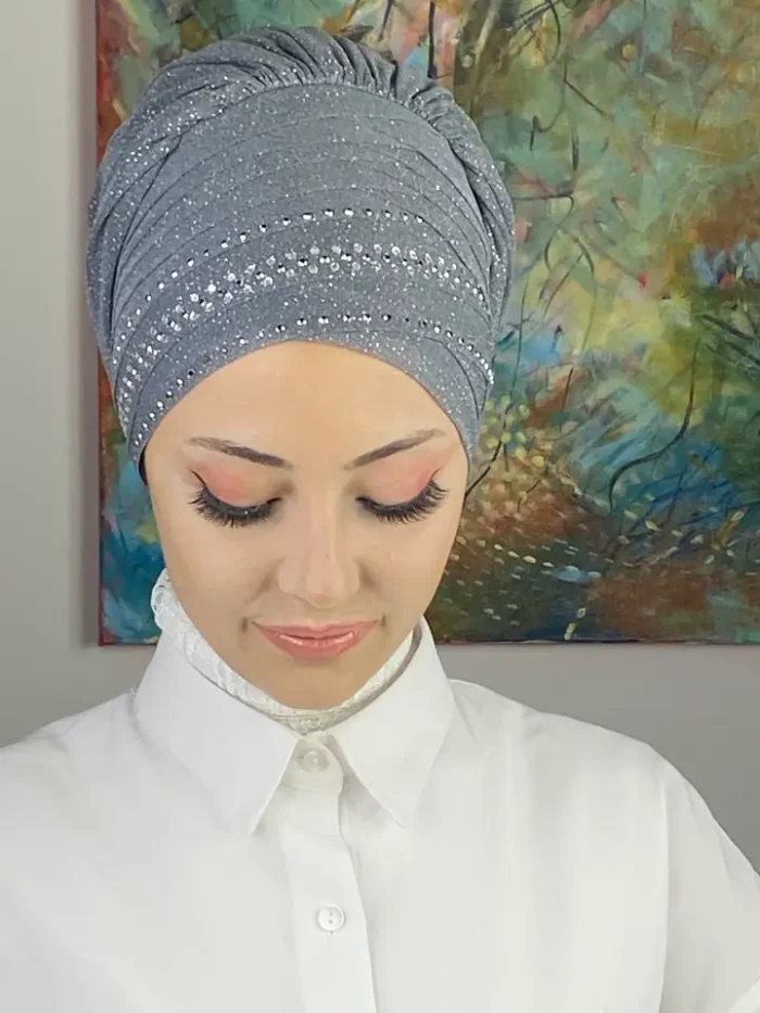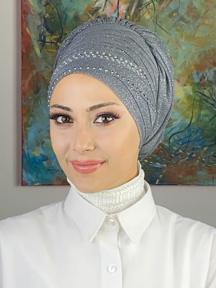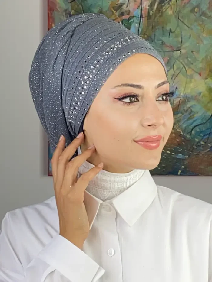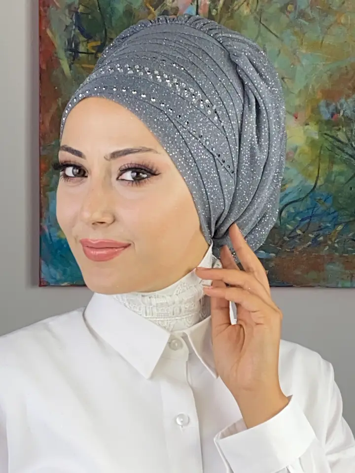 Şıklığınızı tamamlamak için Gümüş Hologram Taşlı ve Konik Ortası Siyah Üç Şeritli Simli Şifon Bone Şal – Gri’yi hemen sipariş edin!