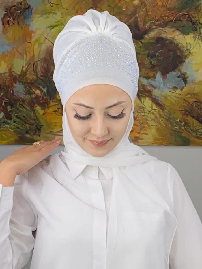 Beyaz taşlı atkılı bone; düğün, davet ve özel günlerde abiye kombinlerin tamamlayıcısıdır.