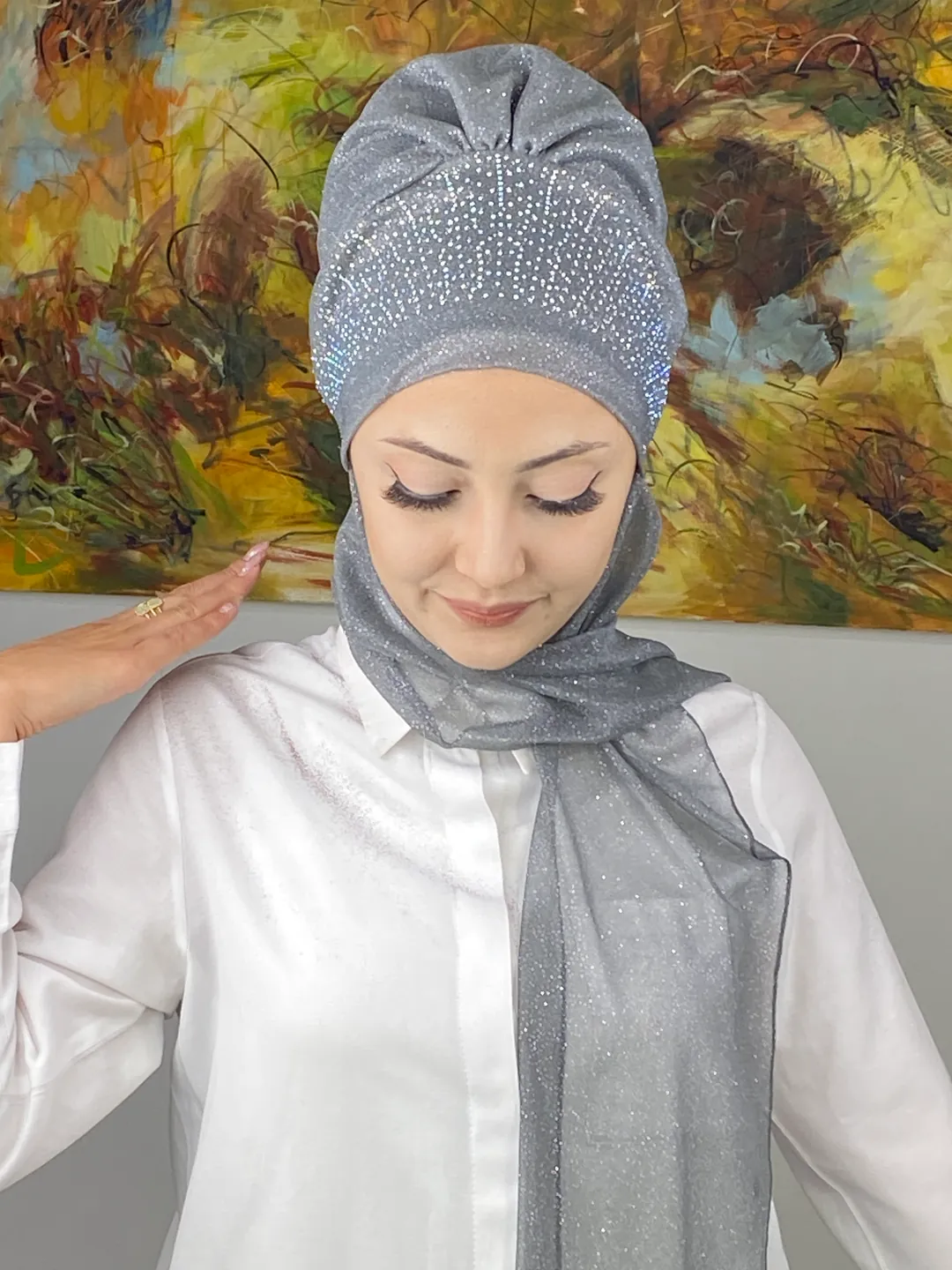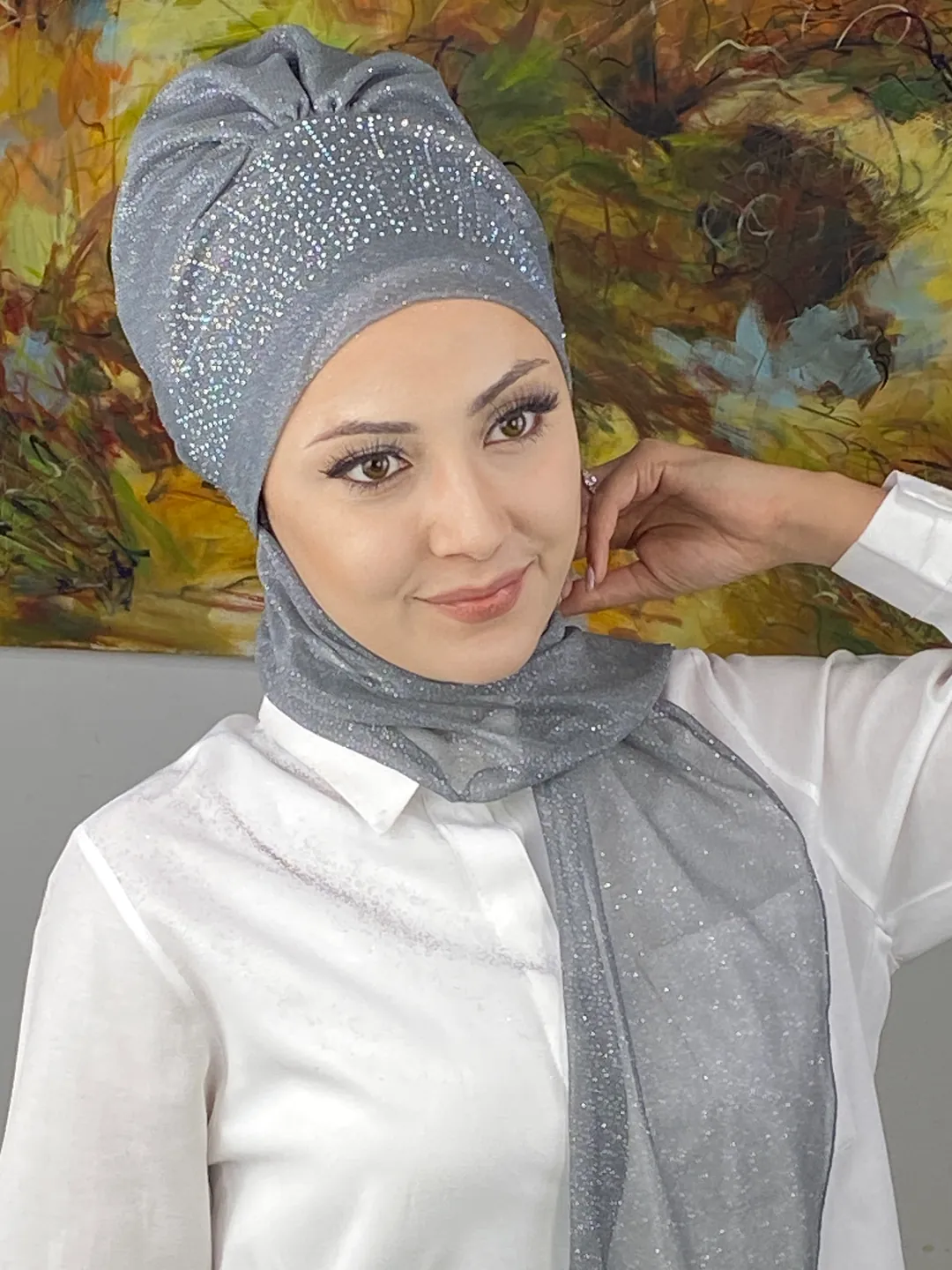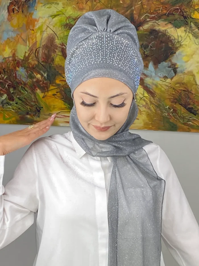 Güneş Model Taşlı Abiye Atkılı Bone Şal – Gri