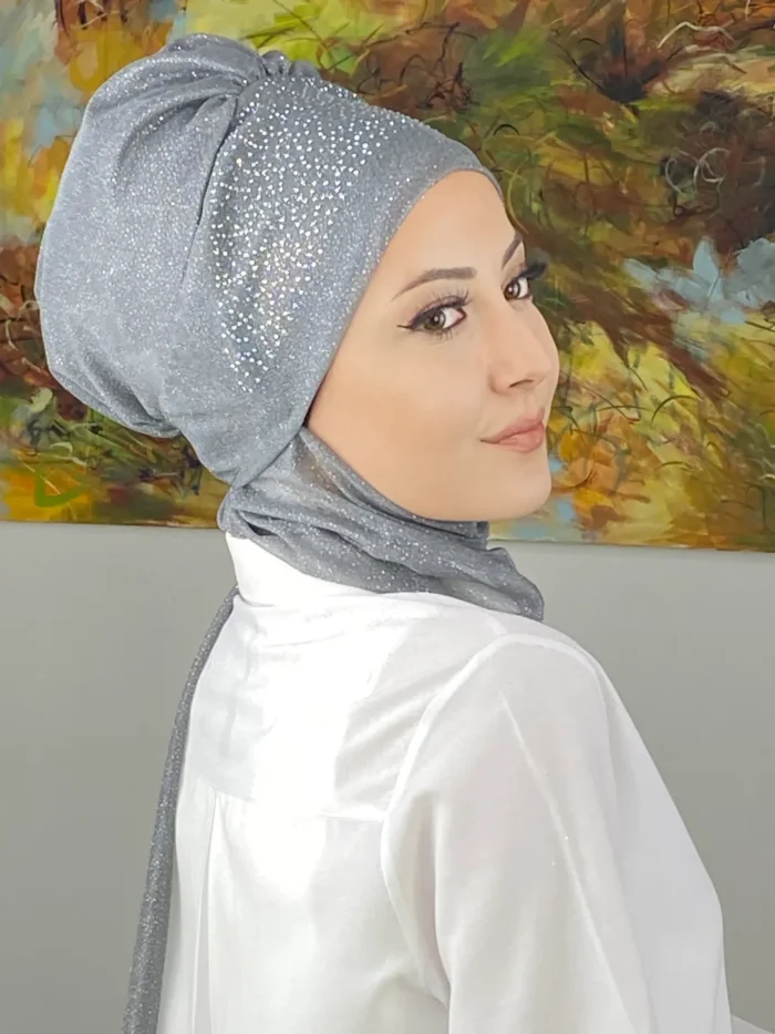 Gri taşlı atkılı bone, abiye kombinlerin tamamlayıcısı olurken,