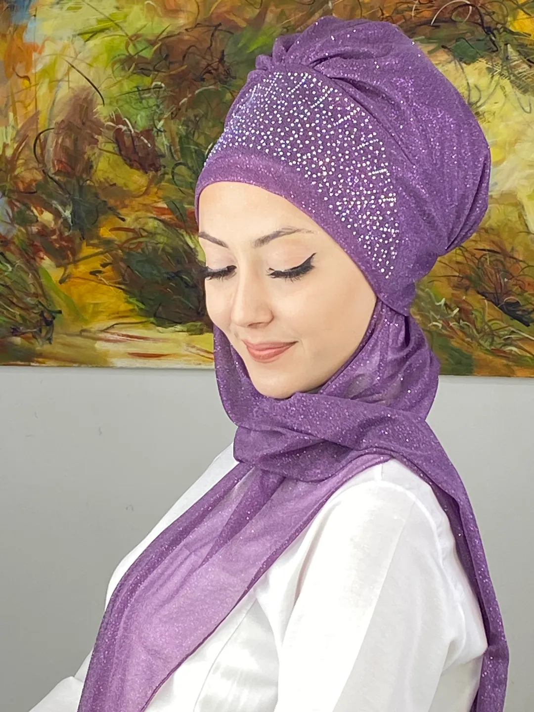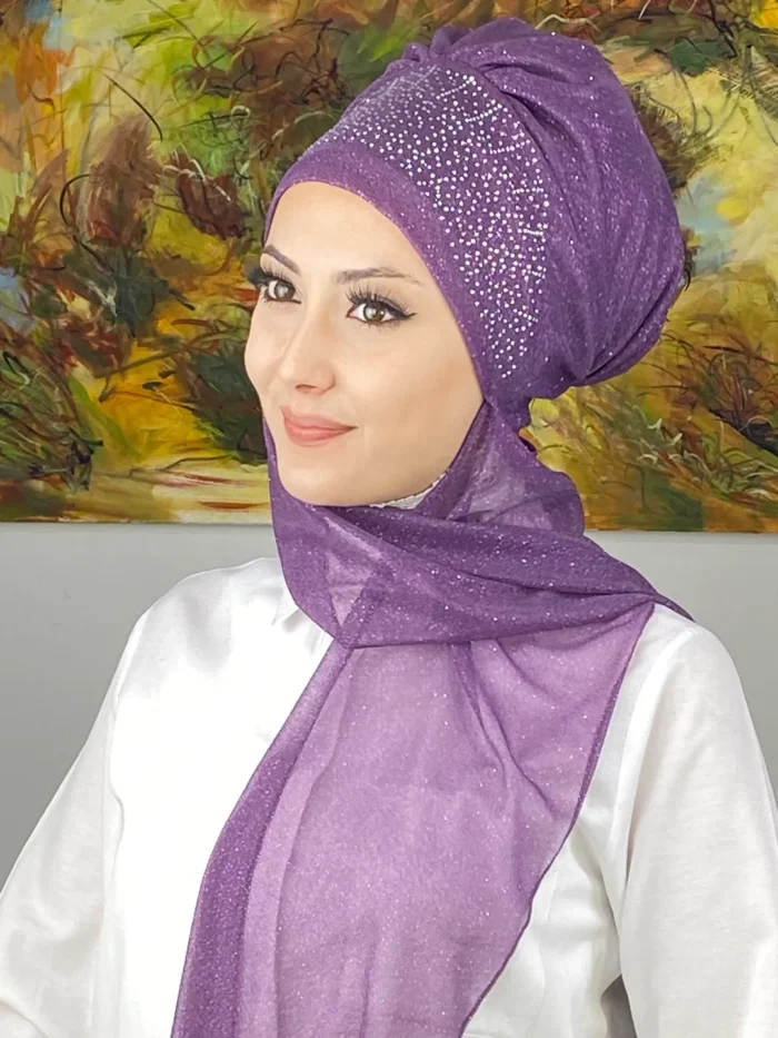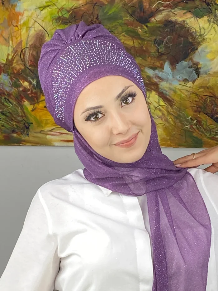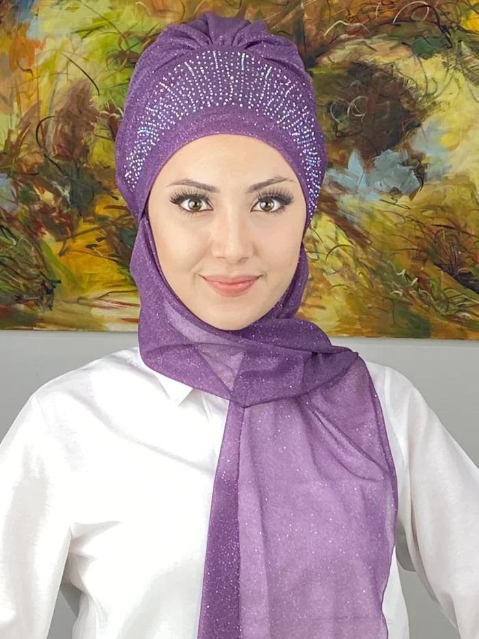 Güneş Model Taşlı Abiye Atkılı Bone Şal – Leylak